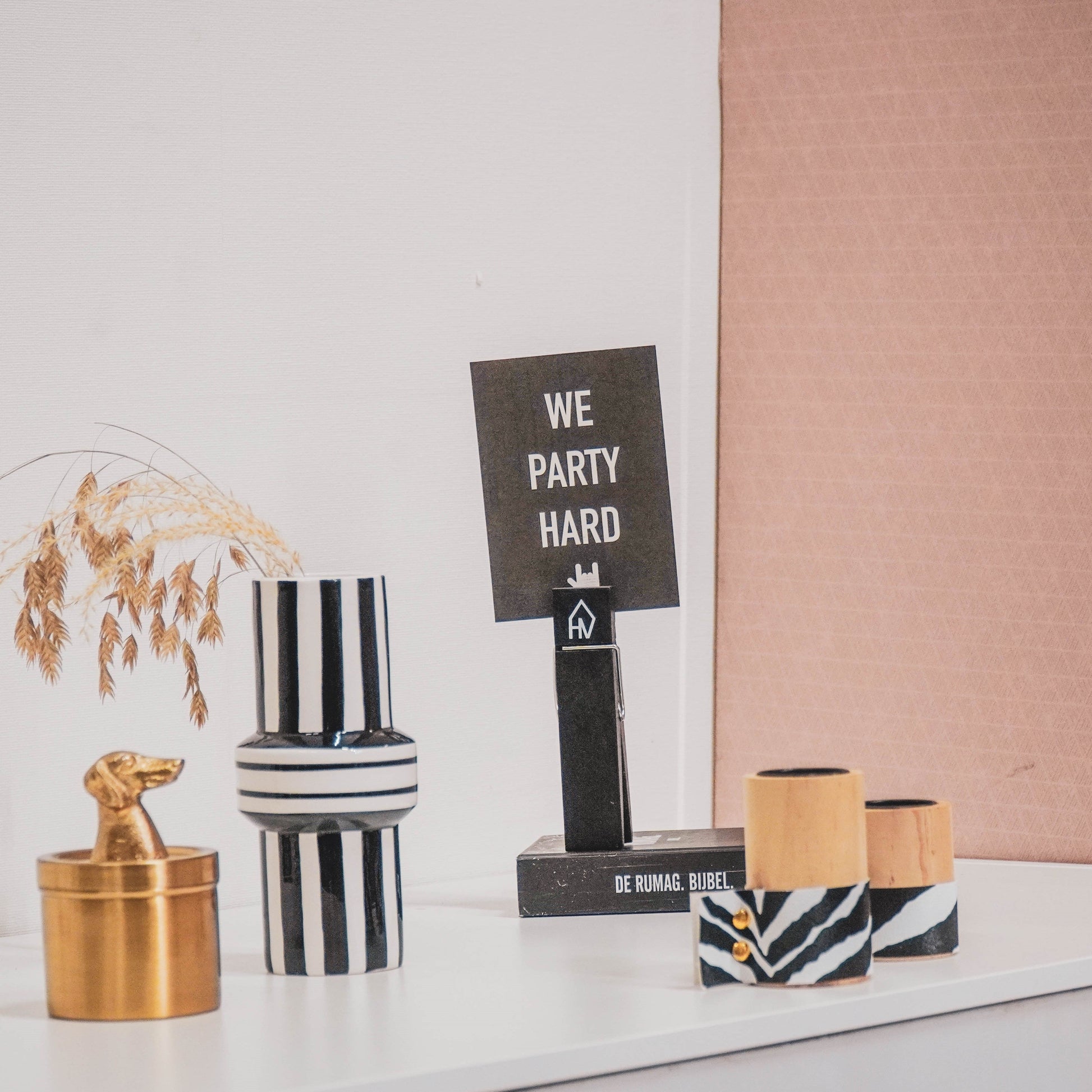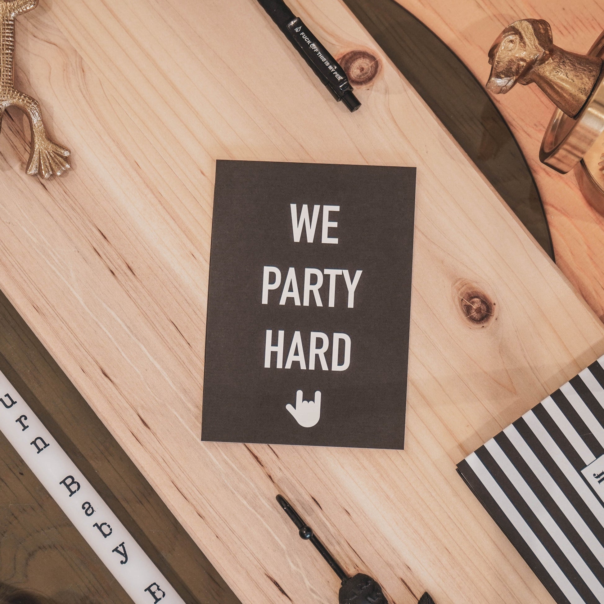WE PARTY HARD - Wij houden van quotes, het is gewoon kunst. Ben je op zoek naar een toffe of stoere quote, een mooie afbeelding of een grappige tekst? Dan vind je die sowieso in de Housevitamin collectie van zwart wit post kaarten. Deze kaarten vragen om een dansje en kun je dus ook super goed gebruiken als uitnodiging voor een feestje.
