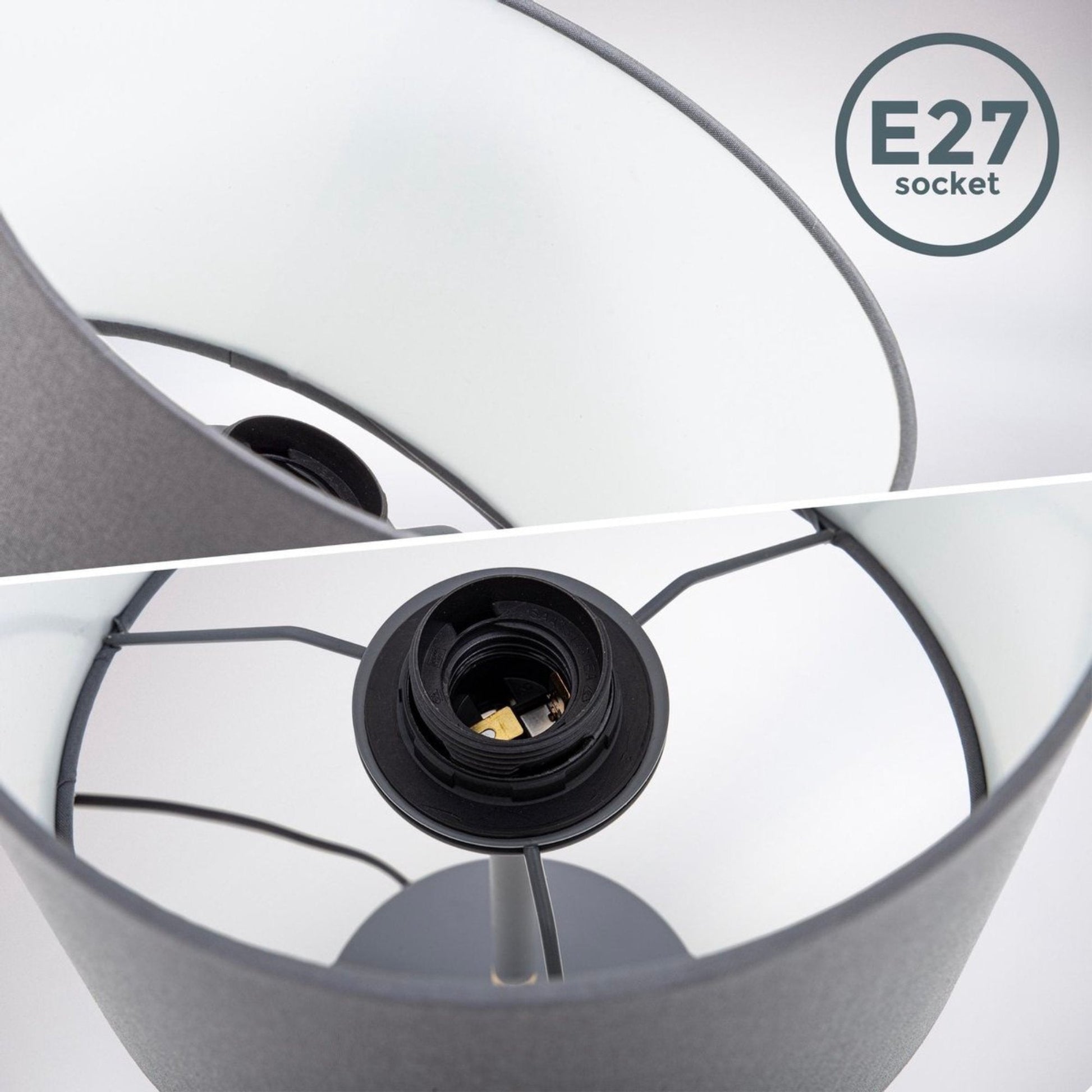 De stoffen kap van de 1 lichts tafellamp is grijs (aan de binnenkant wit) en heeft een diameter van 20 cm.