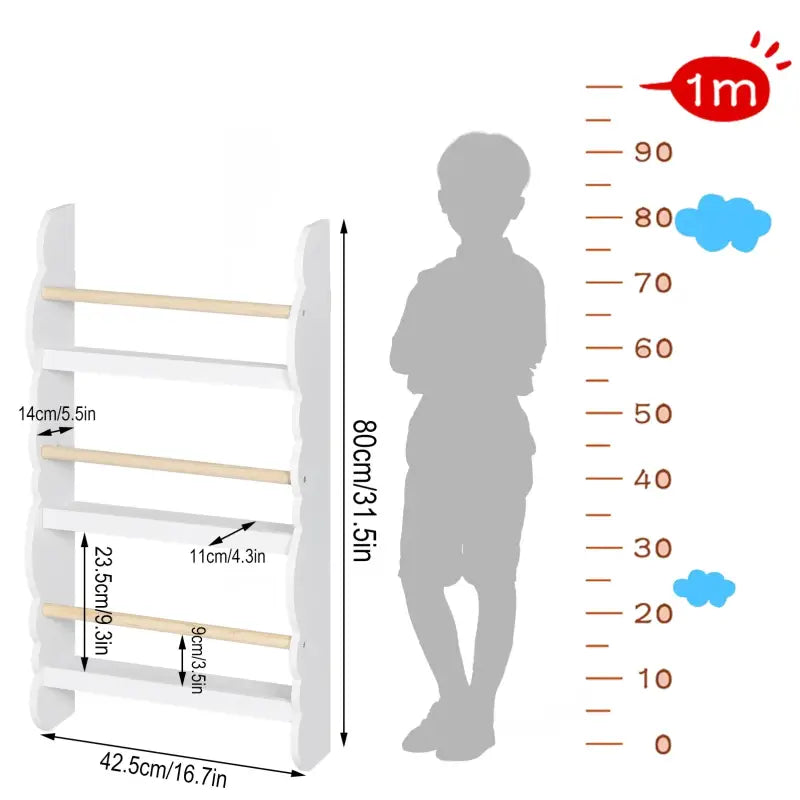 Deze kinderboekenkast wordt geleverd met een gedetailleerde, geïllustreerde installatiehandleiding en alle benodigde accessoires, waardoor het eenvoudig is om aan de muur te monteren. Met afmetingen van 42,5 x 14,5 x 80 cm biedt deze kast voldoende opbergruimte voor boeken en speelgoed, terwijl het gebruiksvriendelijke ontwerp kinderen aanmoedigt om zelfstandig te leren en hun omgeving te verkennen. Met de BukkitBow Boekenkast voor Kinderen creëert u een georganiseerde en inspirerende omgeving waar uw kinderen van kunnen genieten en groeien.