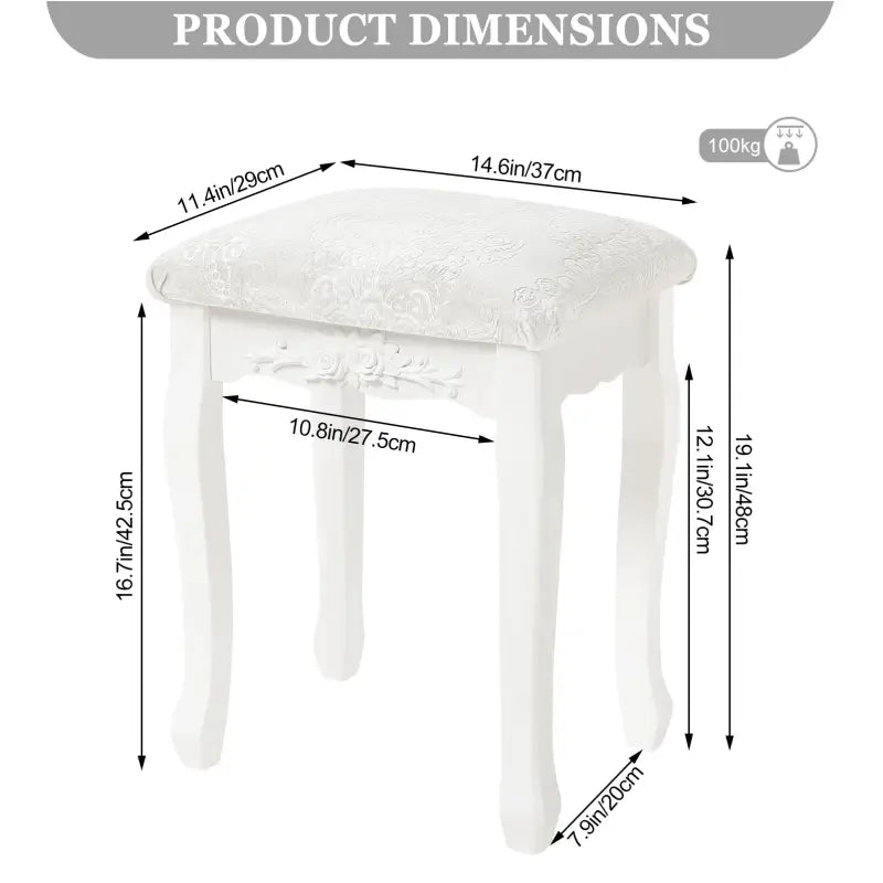 Naast zijn verfijnde uitstraling is deze kruk ook ontworpen met praktisch gebruik in gedachten. Met een draagvermogen van 100 kg en antislip pads onderaan de poten, biedt deze kruk stabiliteit en veiligheid tijdens gebruik. Het eenvoudige montageproces wordt nog gemakkelijker gemaakt met de meegeleverde montageaccessoires en duidelijke montage-instructies, zodat je snel kunt genieten van de schoonheid en het comfort van deze prachtige kaptafelkruk.