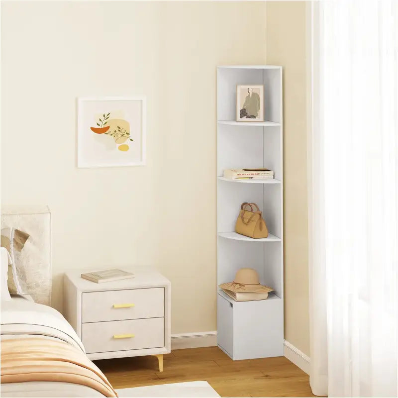 De hoekkast beschikt over vijf open planken en een kast met een deur. Dit biedt voldoende ruimte voor het organiseren van boeken, decoraties, planten en persoonlijke spullen. De open compartimenten zorgen voor snelle toegang tot vaak gebruikte items, terwijl de kast met verzonken greep en magnetische sluiting privacy biedt voor persoonlijke spullen. Deze multifunctionele plank kan worden gebruikt in de woonkamer, slaapkamer, studeerkamer, kinderkamer en meer.