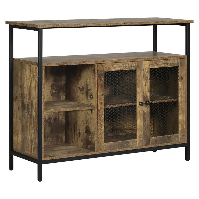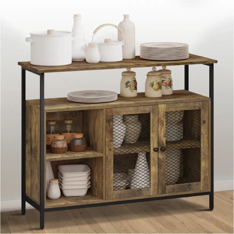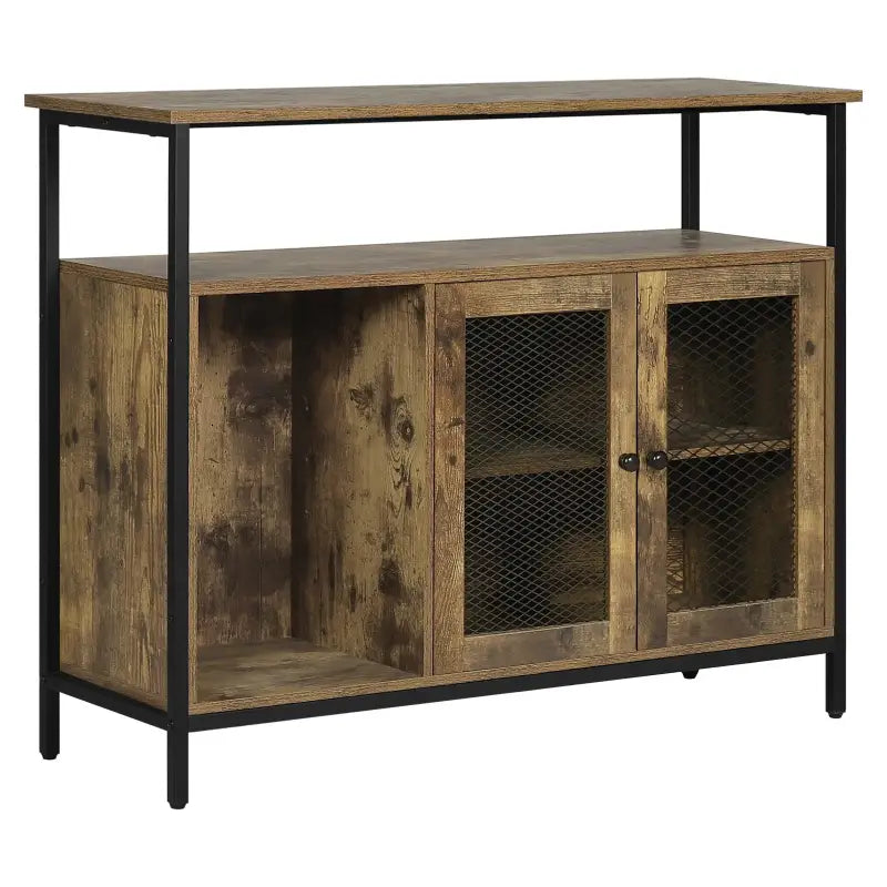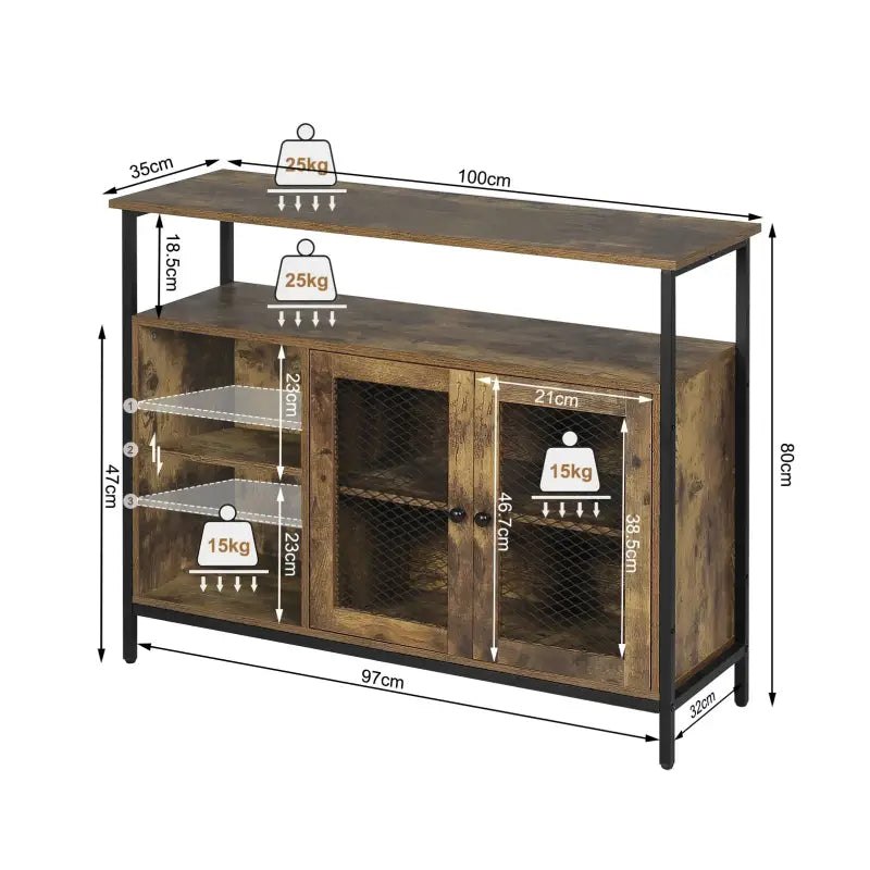 Met de BukkitBow Industriële Opbergkast haalt u een veelzijdige opslagoplossing in huis met een uniek retro design. Deze keukenkast combineert rustieke bruine panelen met een stoer zwart metalen frame en twee zwarte metalen mesh deuren, wat resulteert in een industriële en vintage uitstraling. Met een totale grootte van 100x35x80cm biedt deze opbergkast voldoende ruimte voor diverse opbergbehoeften.