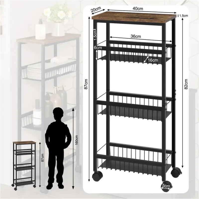 Ontdek de veelzijdigheid en stijl van de BukkitBow keukentrolley met 4 niveaus, een ideale oplossing voor je opslagbehoeften. Deze trolley biedt een ruime opbergruimte met een werkblad en drie open manden die perfect zijn voor het opbergen van allerlei items, van keukenbenodigdheden tot boeken en verzorgingsproducten. De combinatie van zwart en vintage houtlook geeft een elegante uitstraling die moeiteloos in elke ruimte past.