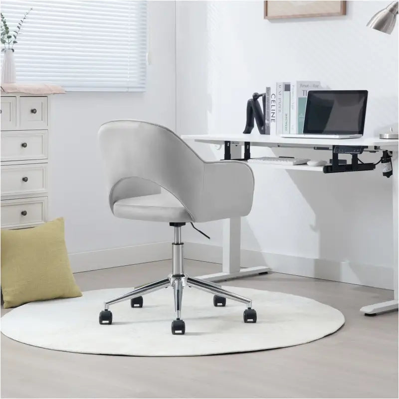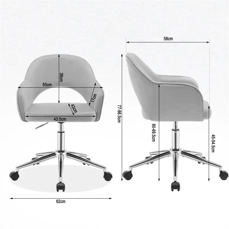 Deze bureaustoel straalt elegantie uit dankzij het holle, halfronde ontwerp van de rugleuning, waardoor de lucht kan circuleren en je zelfs na langdurig zitten niet verstikt raakt. De zachte fluwelen bekleding en stevige metalen basis creëren een harmonieuze en decoratieve sfeer in elke kamer.