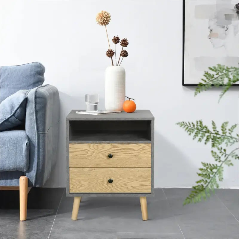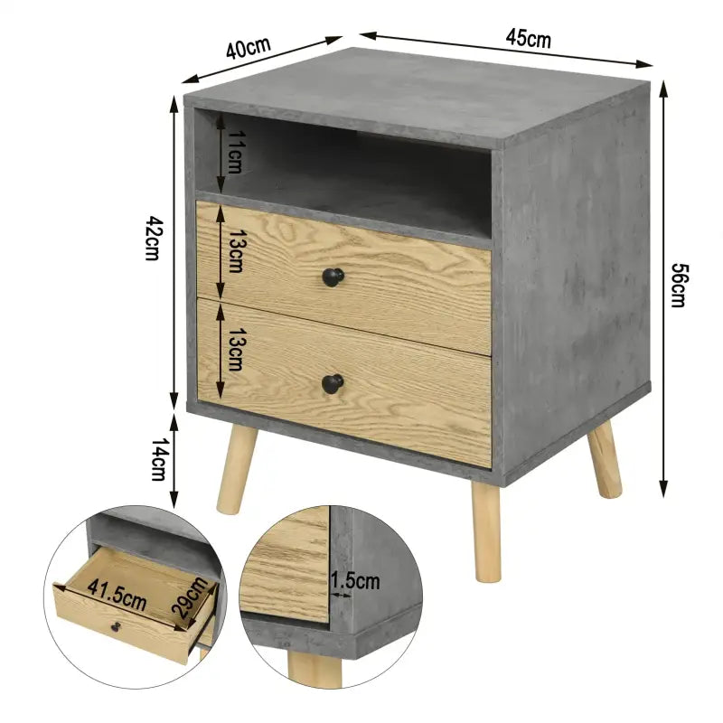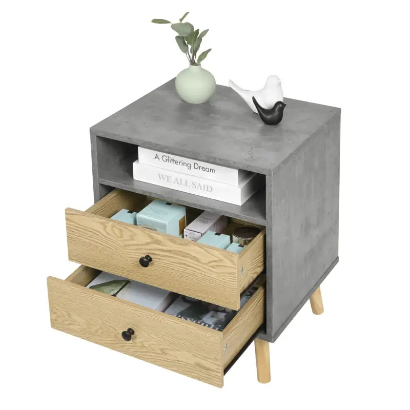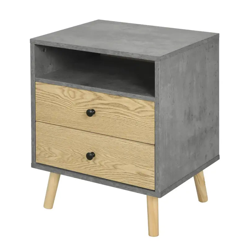 BukkitBow - Nachtkastje met 2 Laden - Grijs met Licht Eikenhout - Max Belasting: 30KG - 45x56x40cm