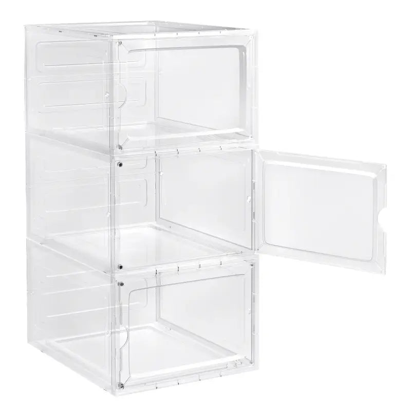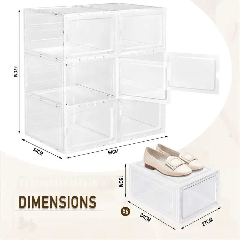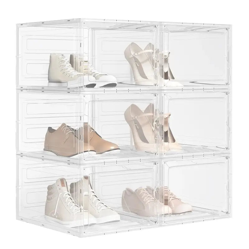 Dankzij het stapelbare ontwerp kunnen de sets van 3 of 6 schoenenopbergdozen eenvoudig op elkaar worden gestapeld of zij aan zij worden verbonden, waardoor je de vorm van je schoenenopslageenheid kunt aanpassen. Dit bespaart kostbare ruimte in je kast of bijkeuken en biedt een handige manier om je schoenen georganiseerd te houden.