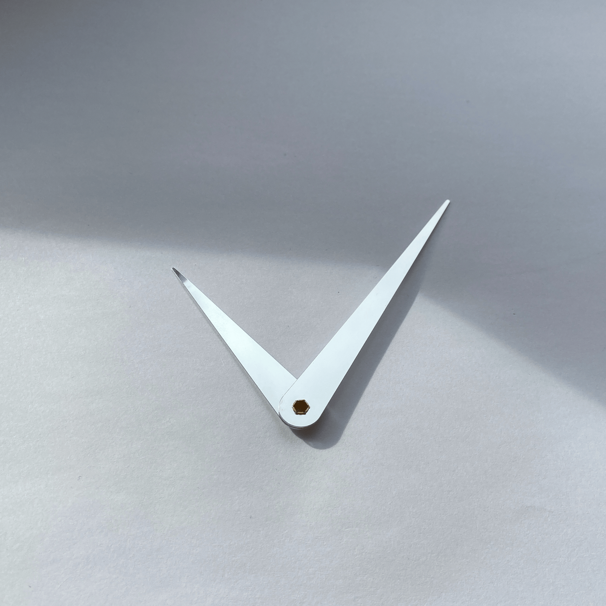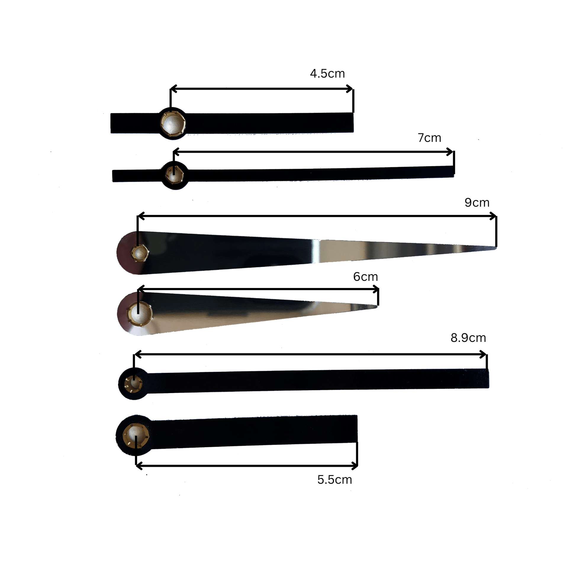 The hands you need to have a beautiful clock on the wall. A clock hand is an arm that connects to the shaft on a clock movement that overlays over a clock dial face and points to the numerals or symbols on the clock face or watch that displays the time. Most clocks have a short hour hand a long minute hand and a long second hand to display the time. This set contains of 3 small sets of hands for a clock that must be bigger then Ø20cm diameter.