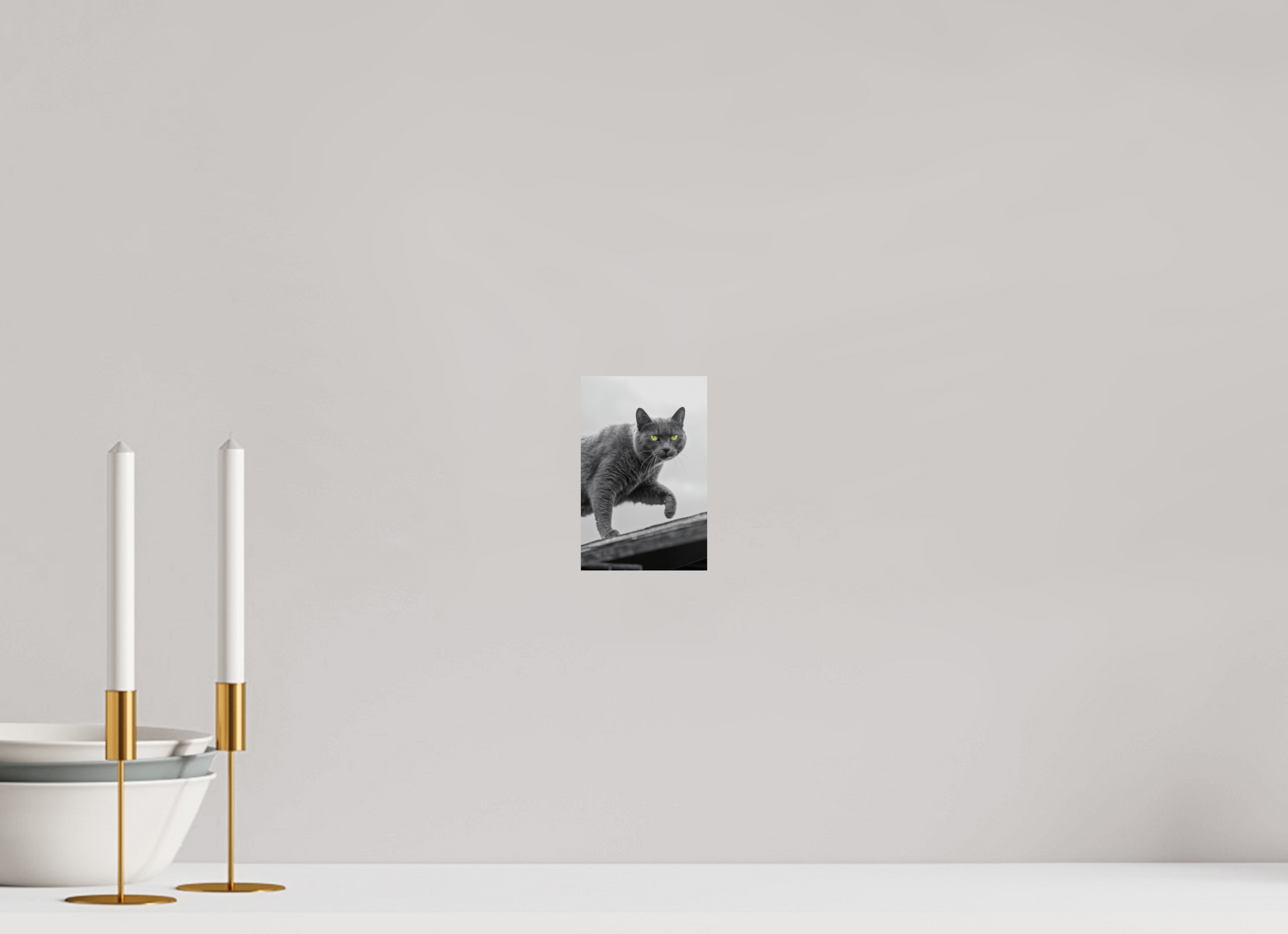 Add a touch of mystery and modern elegance to your interior with this breathtaking photo print. A powerful, gray cat prowls a roof edge, captured in a stylish black-and-white palette. Its intense, emerald eyes pierce the monochrome world and immediately capture your attention.