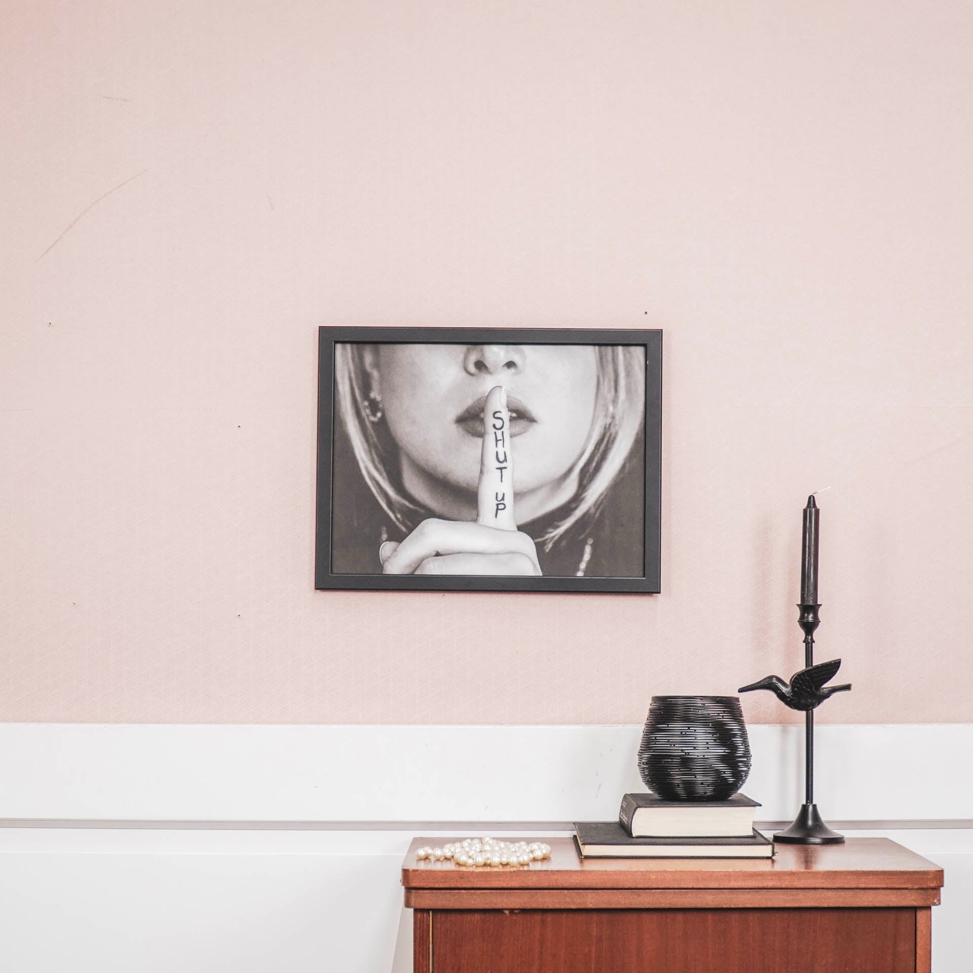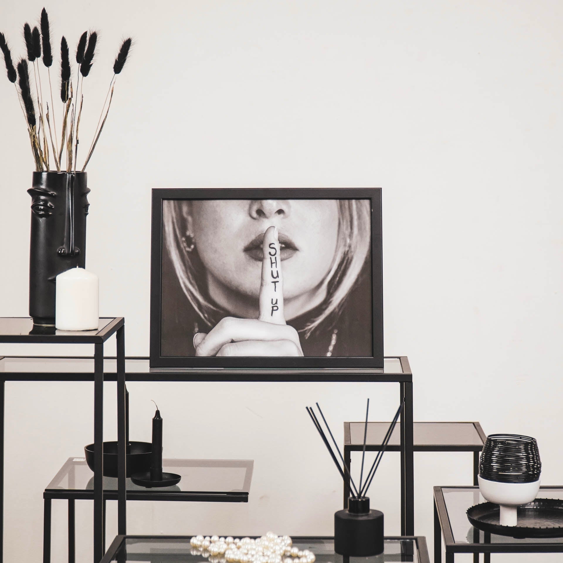WALL ART - Met grote trots presenteren wij onze kunst posters. Zwart wit posters met kunst foto's en quotes. Op deze zwart wit poster wordt 'Shut up' op een stijlvolle manier geuit. Waar zou jij deze modieuze poster met quote ophangen?