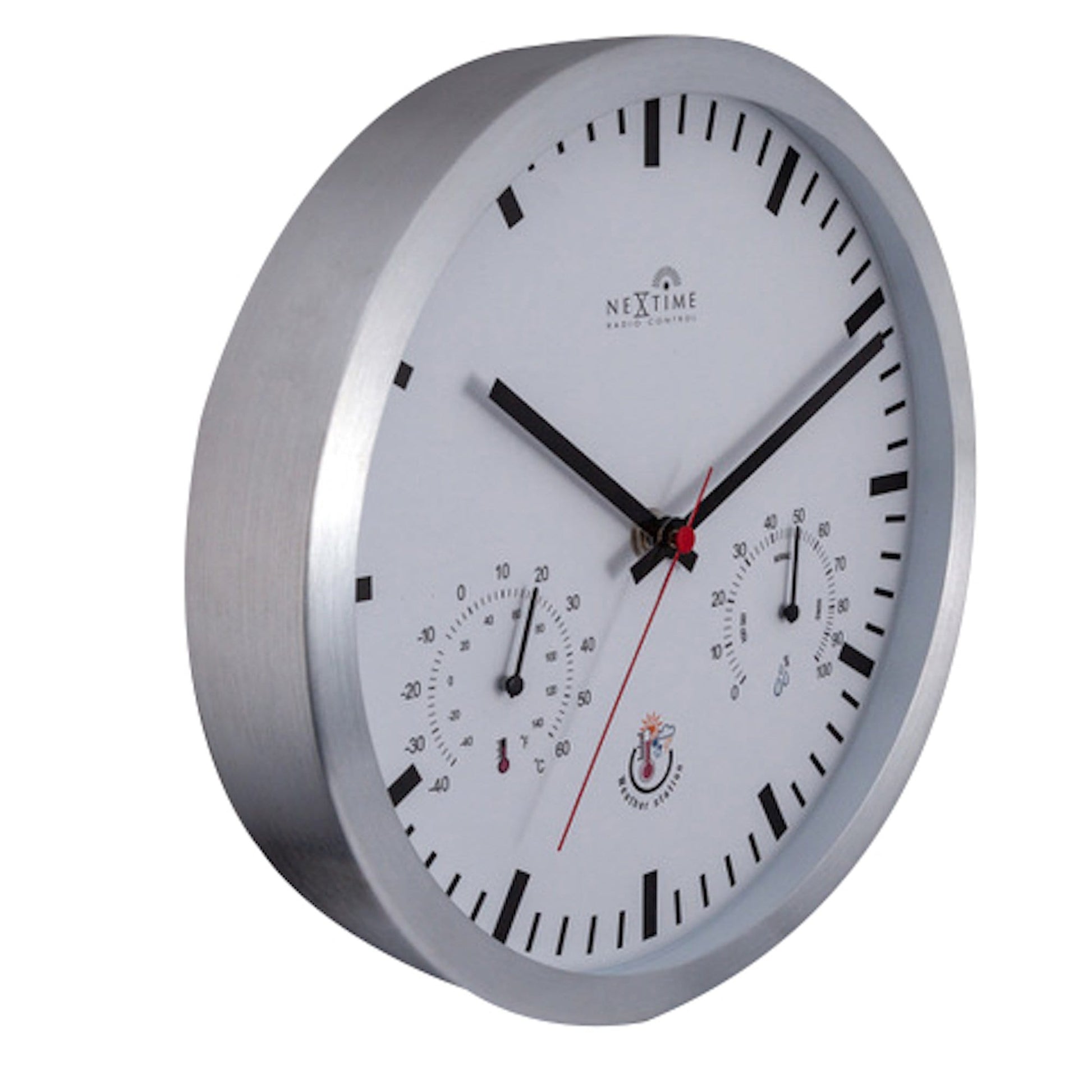 The NeXtime "Radio Control Weather Station" is a wall clock with a clear index and big hands, so the clock is easy to read. This weather station has a build in thermometer and a hygrometer, what makes it easy to predict the local weather. Next to this, the time of the clock will be set automatically because of the Radio controlled signal from Frankfurt. You don't have to worry about summer- or wintertime, the clock will set itself to the correct time. Size. Ø25 cm.