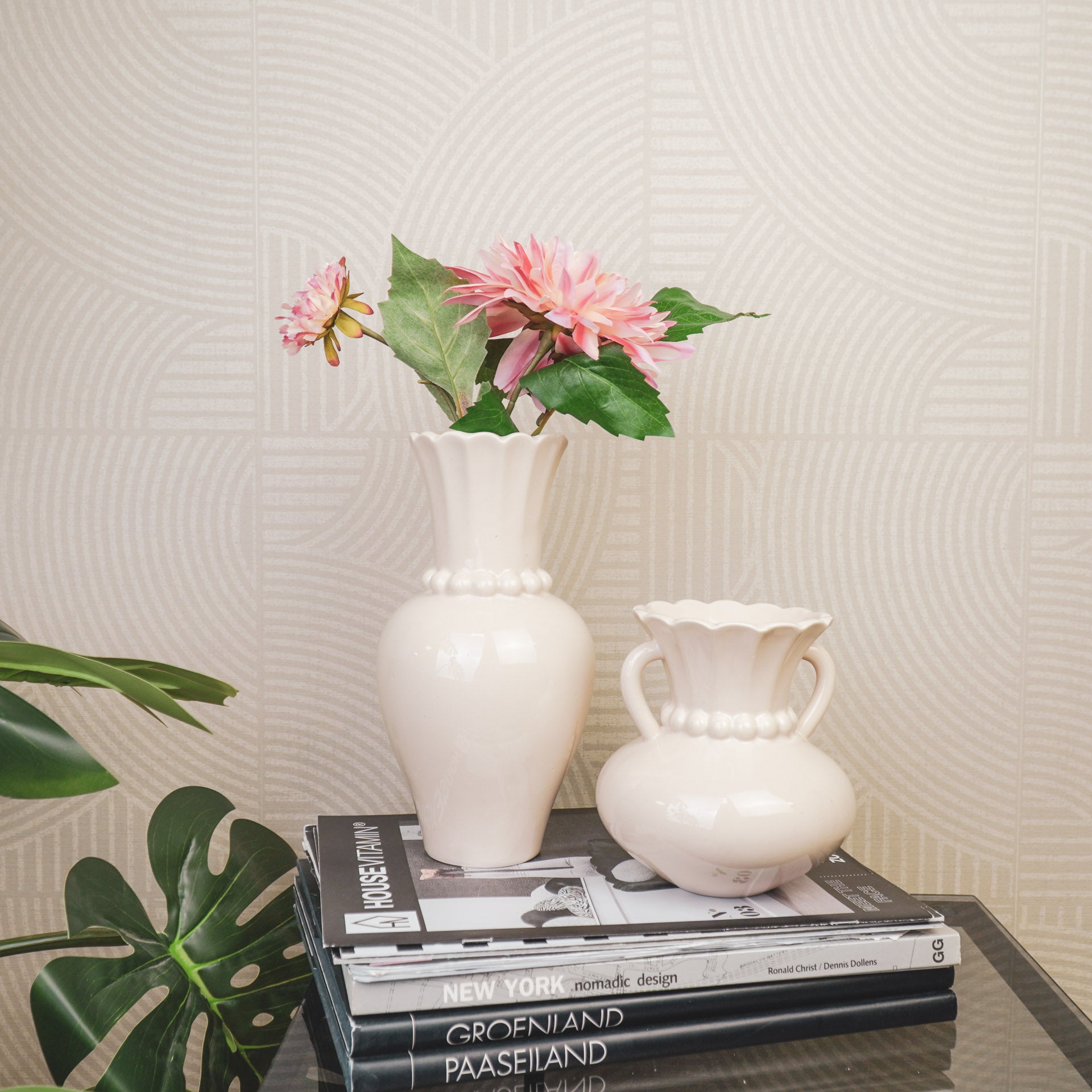 VAASJE MET DE PAREL- Vazen heb je nooit genoeg! Dit vaasje kun je makkelijk combineren met andere vaasjes of kaarshouders. Met het mooie parel halsje heeft dit beige kruikvaasje echt een unieke uitstraling.