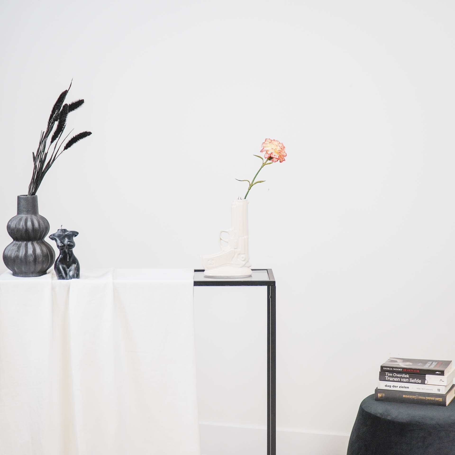 Styling tip: Ook zonder bloemen staat de pistool vaas leuk, zet hem daar neer waar nog iets stoers nodig is.