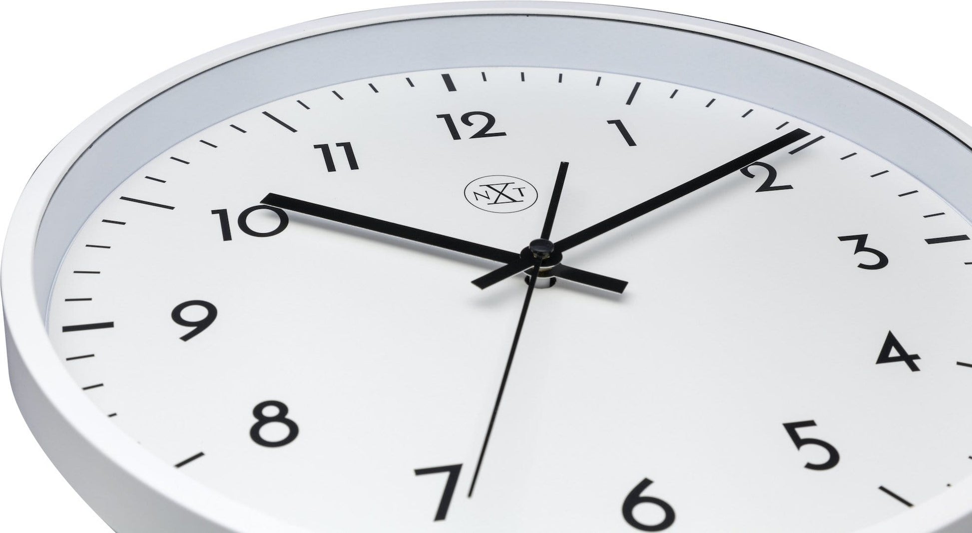The nXt "Easy Big" is a plastic white wall clock (Ø 30 cm). The dial has clear numbers and bold hands. It runs on 1x AA battery (not included).
