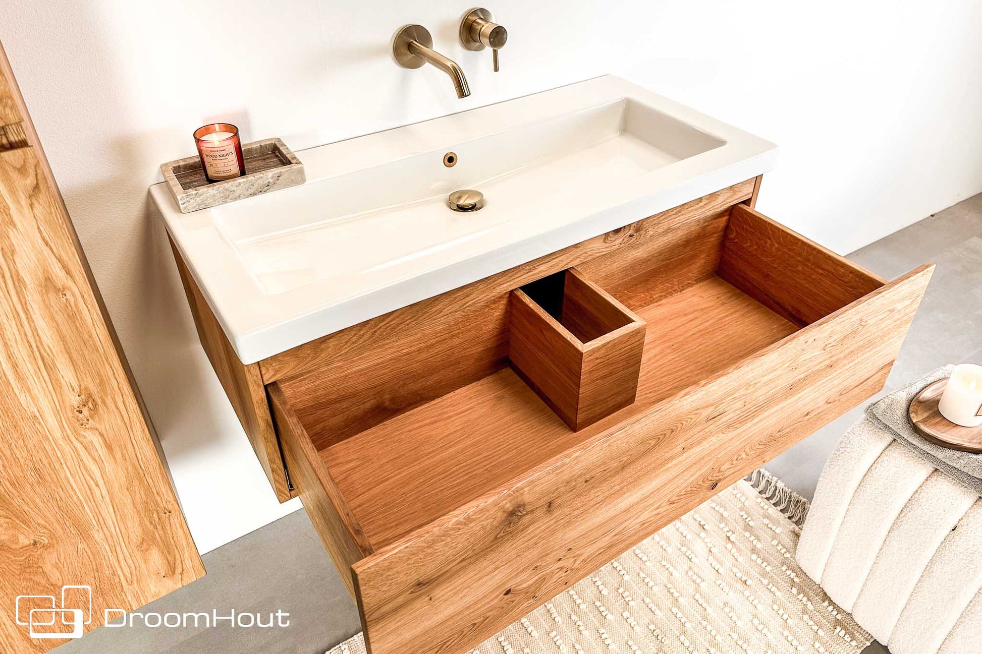 DroomHout staat bekend om aandacht voor detail en kwaliteit. Elke badkamermeubel wordt met de hand gemaakt en afgewerkt om ervoor te zorgen dat elk stuk aan de hoogste normen voldoet. Daarnaast is er keuze uit 12 kleuren noten en eiken kleuren om zo de badkamermeubel van jouw dromen te maken. Kijk gerust eens naar deze 8 tips voor een droombadkamermeubel of kom langs in de showroom om inspiratie op te doen
