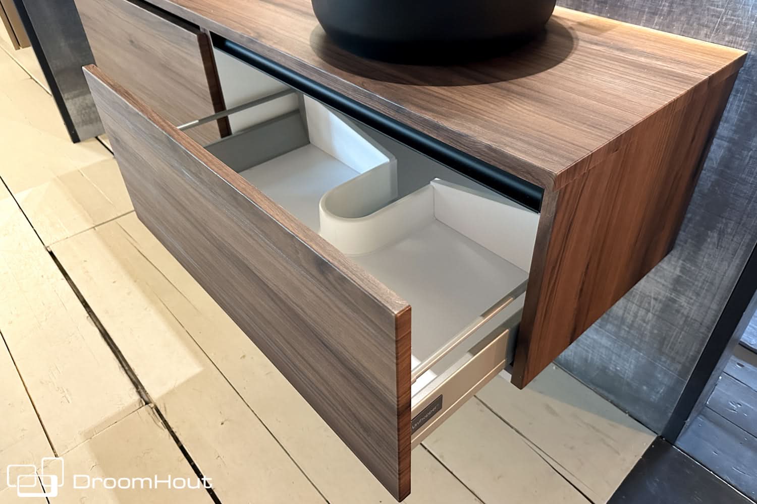 De lade heeft soft close, dus hard dicht rammen gaat je niet lukken. De greeplijst boven de lade is standaard mat zwart, maar kan ook in aluminium kleur of in de kleur van het meubel geleverd worden. Wat vind je mooi? Ga lekker los met de bijpassende zwarte waskom, bronzen kraan en je hebt een stijlvol geheel, helemaal in de trant van nu.