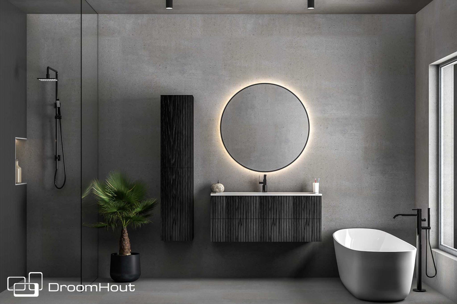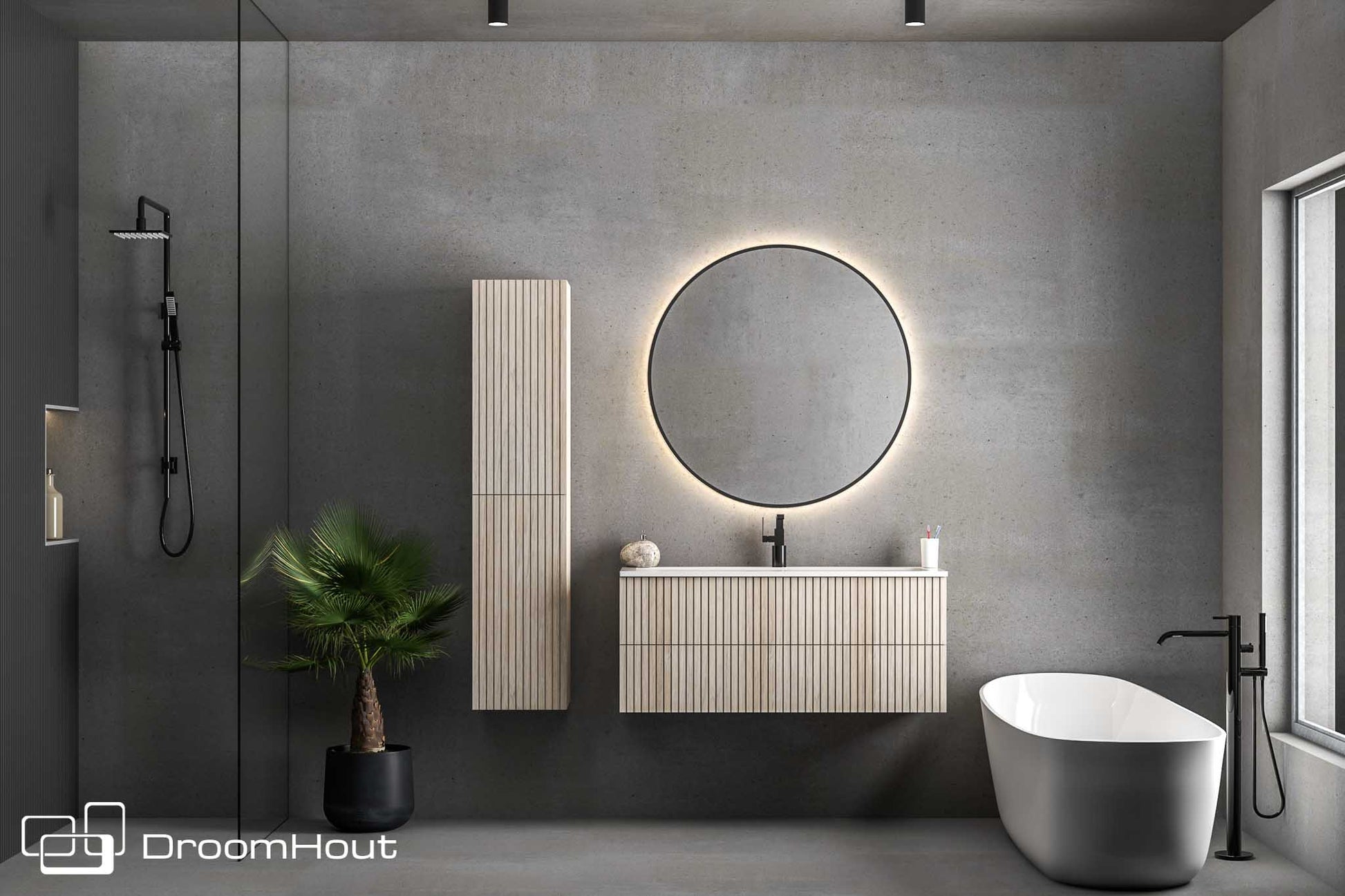 Badkamerspiegels als de ronde badkamerspiegel Circle is een mooie aanvulling op het badkamermeubel Wave. Deze is leverbaar met verschillende kleuren randen, of een kleurloze rand. Ook badkamerkranen in dezelfde kleur als de rand van de spiegel met bijpassende clickwaste zijn mooi om te matchen. En mocht je een andere waskom willen dan het wastafelblad dat we standaard bieden, dan is dat ook mogelijk. Plan een afspraak in om je wensen te bespreken of stuur ons een mail naar info@droomhout.nl.
