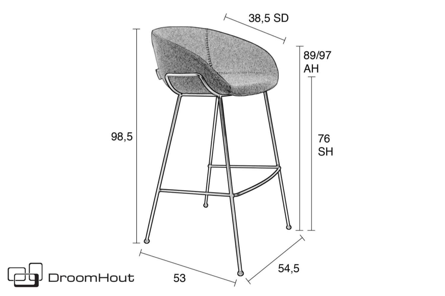 De Feston heeft een brede kuipvormige zitting waarin je heerlijk comfortabel in zit. De afmetingen van de zitting zijn lekker royaal. De barkruk is namelijk 54,5 cm breed en 53 cm diep. De totale hoogte van de barkruk is 98,5 cm. De diepte van de zitting is 38,5 cm en de hoogte van de zitting is 76 cm. De voetsteun zit op een hoogte van 34,5 cm. Al met al een heerlijke barkurk voor aan een hoge tafel of bar.