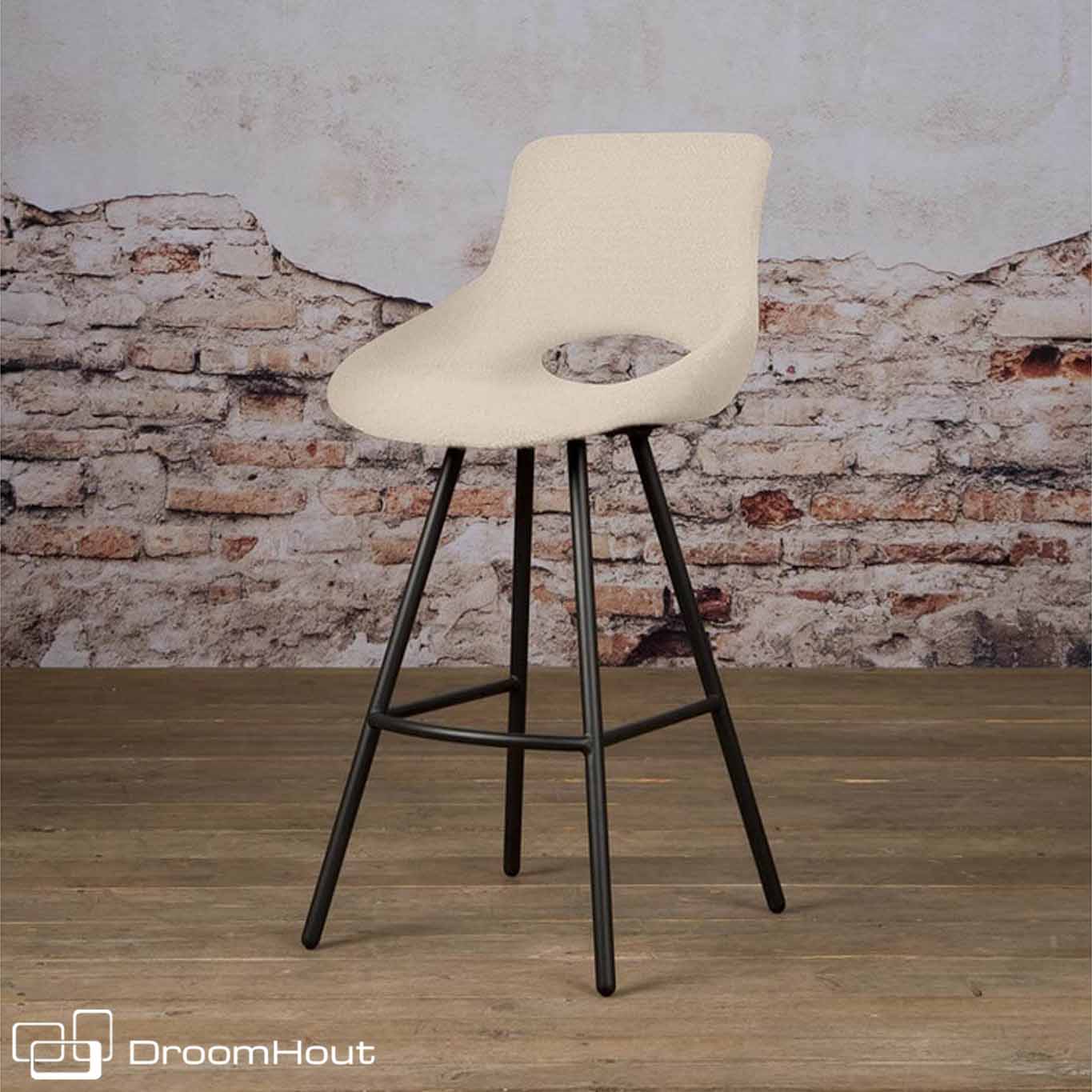 De barkruk heeft een ergonomisch gevormde kuip en een gave opening in de rugleuning. Zo kun je de kruk gemakkelijk verplaatsen en en hij oogt hierdoor wat luchtiger in de ruimte. De stof op het kuipje is een zachte teddy stof, verkrijgbaar in de kleuren wit, lichtbruin (of taupe) en donkerbruin.