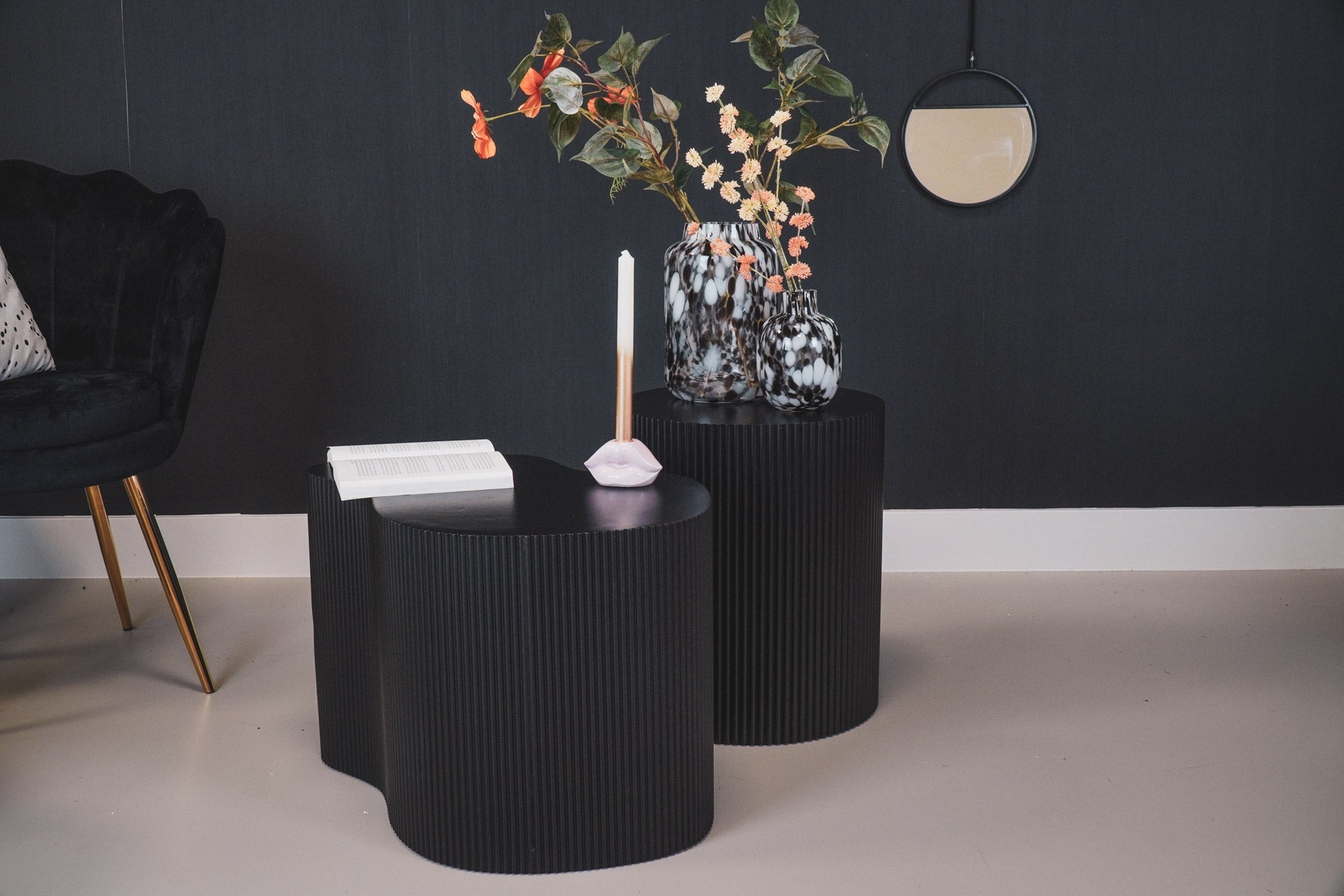 Styling tip: Deze tafel heeft niet veel nodig qua aankleding. Zet je mooiste vaas met stapel boeken als verhoging en een kandelaar voor ambiance op de mooi gevormde bijzettafel en je bent klaar.