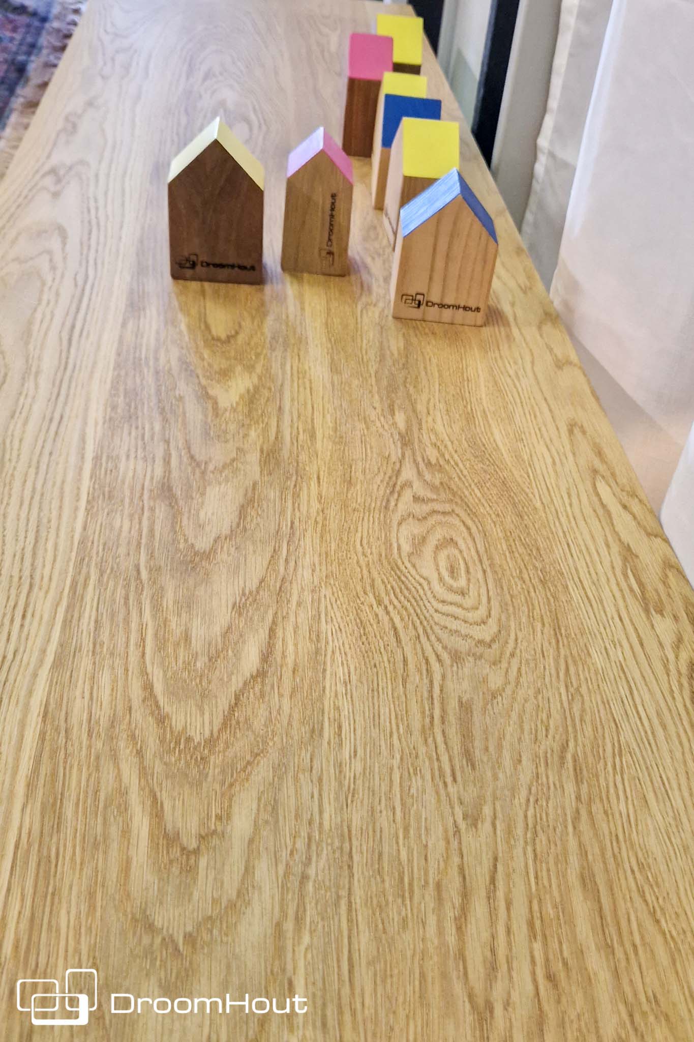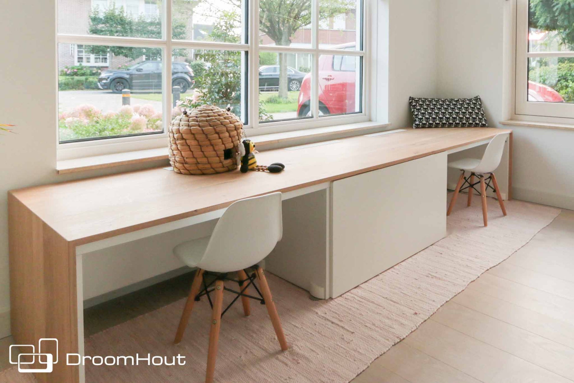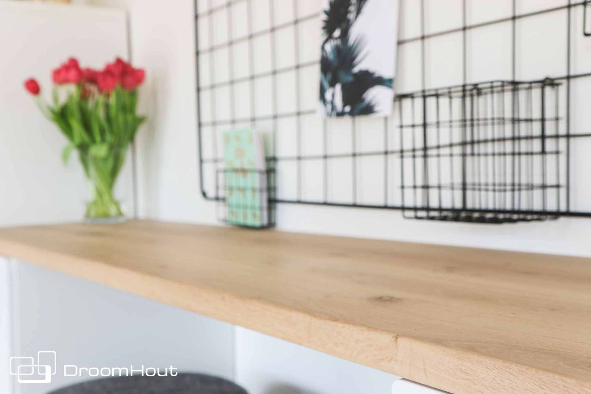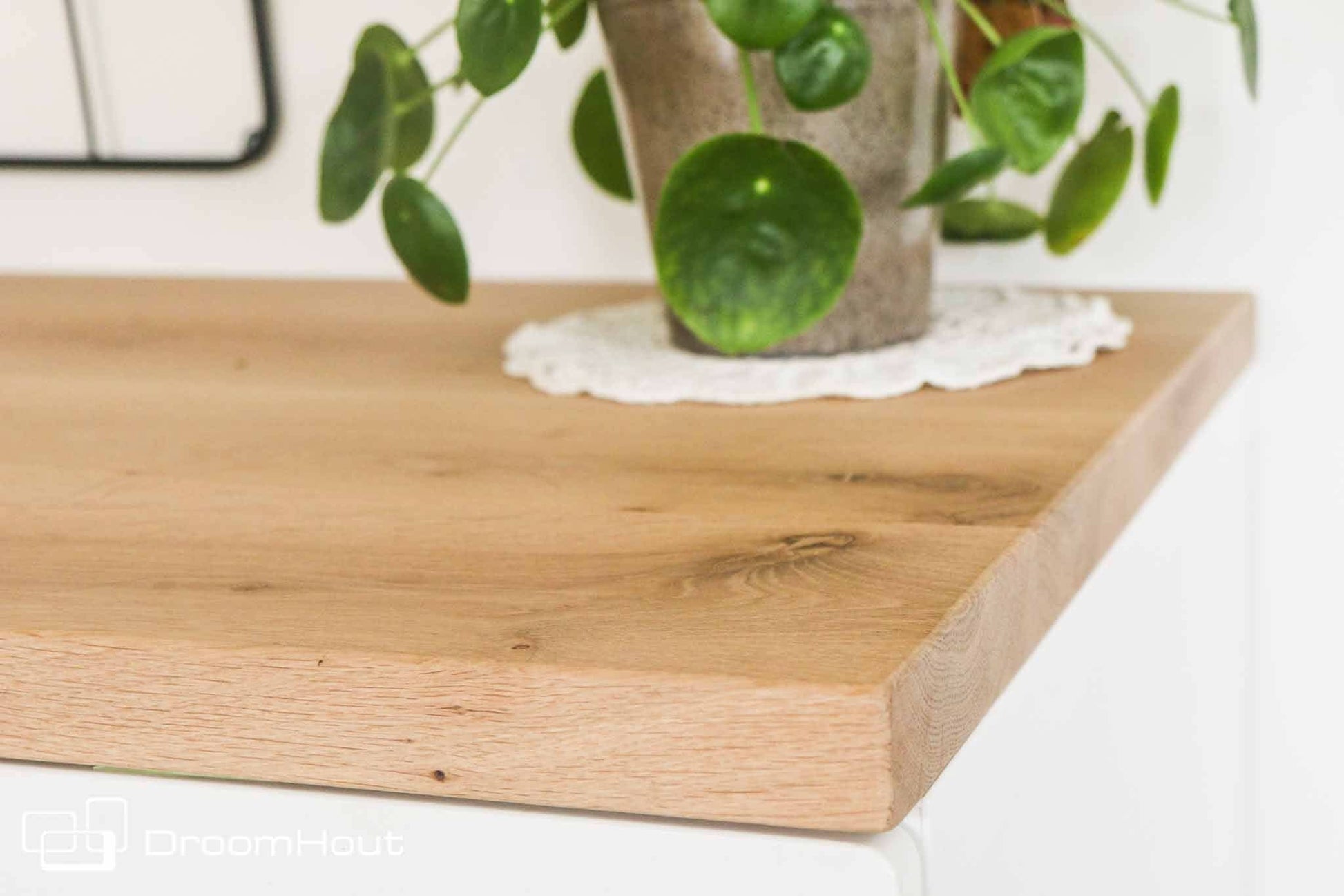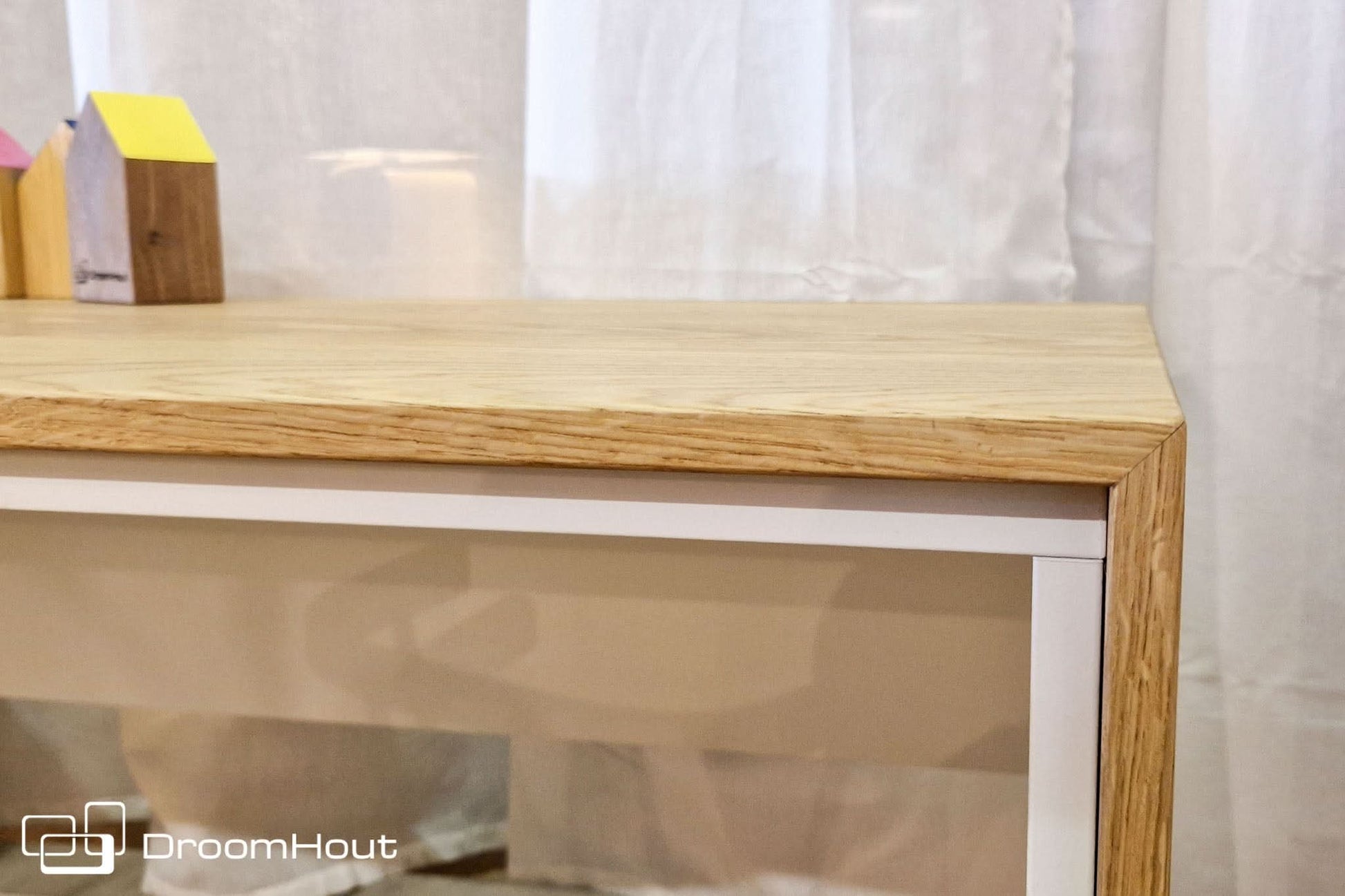 Je kunt je speelhoek zo groot maken als je wilt. Het massief eiken blad voor de SMÅSTAD speelkist is in diverse afmetingen verkrijgbaar, vanaf 90 cm tot een lengte van 360 cm. Voor op 1, 2, 3 of 4 speelkisten. Maar wil je een combinatie maken met een andere afmeting dan is dat natuurlijk ook mogelijk, neem dan contact met ons op. Je kunt kiezen voor een 18 of 30 mm dik massief eiken blad. De bladen zijn 52 of 57 cm diep, dit ligt maar net aan de variant die je kiest. Vervolgens heb je ook nog de keuze of je het blad door ons laat behandelen met een matte transparante lak en in kleur of je laat het onbehandeld. Wij lakken het blad 3x aan beide zijden zodat het optimaal beschermd is en toch een onbehandelde natuurlijke uitstraling heeft. Dit blad wordt standaard geleverd zonder zijkanten, deze kunnen op verzoek op maat worden toegevoegd.
