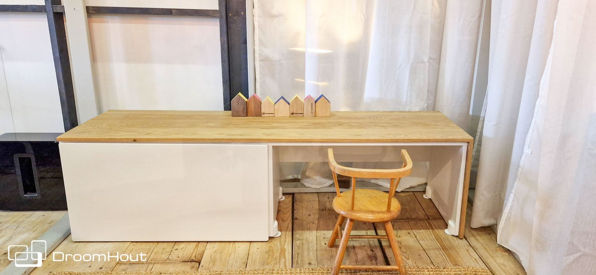 Haal het maximale uit de SMÅSTAD speelgoedkist door deze te koppelen met een massief eiken blad. Plaatst 2 kisten met minimaal een meter ruimte ertussen, plaats daar een mooi houten blad overheen en je hebt een geweldige speeltafel met opbergruimte. De kisten hebben een hoogte van ca. 50 cm, een perfecte hoogte voor kleine kinderen. Heb je meteen een heel mooie speelhoek. En sowieso, elke IKEA hack met hout is gaaf!