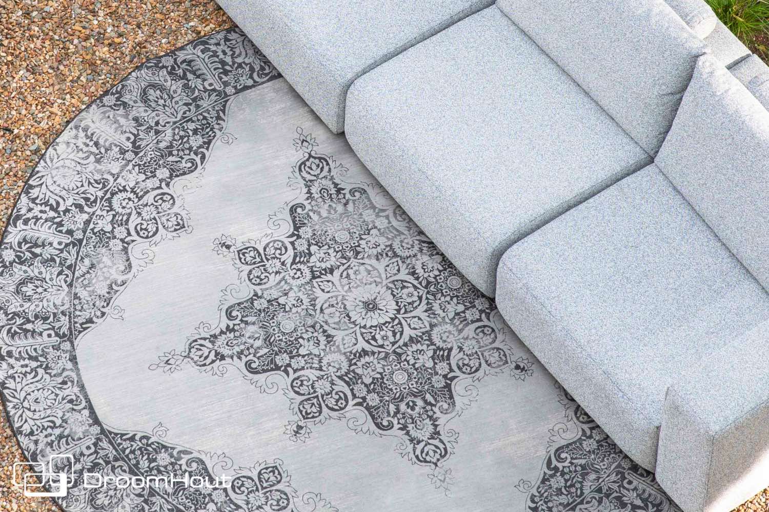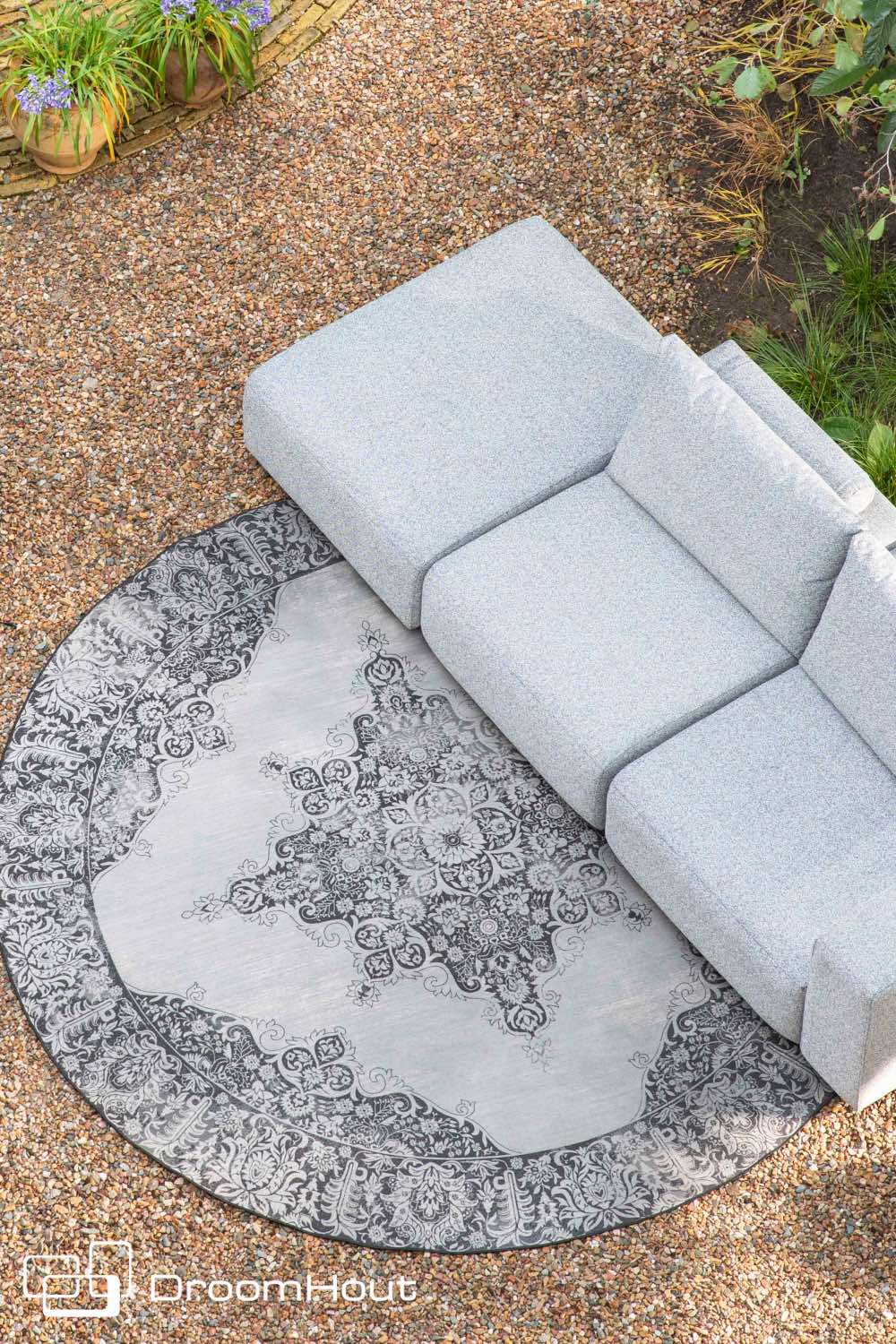 Ronde vormen zijn helemaal hip. Het zorgt voor een levendige organisch effect. Een rond vloerkleed doorbreekt ook de hoekige vormgen en het kadert minder af waardoor je loungeset meer bij de tuin betrokken wordt. Hoogte van het kleed is slechts 3 mm, laag zodat je er niet snel over struikelt.