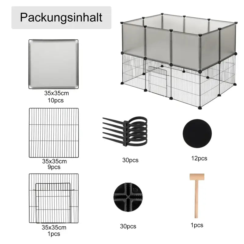 De BukkitBow Aanpasbare Kleine Dierenren biedt een veelzijdige speelruimte voor uw geliefde huisdieren. Met afmetingen van ongeveer 107 x 72 x 72 cm en een aanpasbaar ontwerp naar twee niveaus, is deze ren perfect geschikt voor hamsters, cavia's, konijnen en andere kleine dieren. Gemaakt van hoogwaardige materialen zoals PP kunststof platen, ijzeren netten en ABS plastic verbindingen, biedt deze ren een stabiele en duurzame omgeving voor uw huisdieren om te spelen en te verkennen.