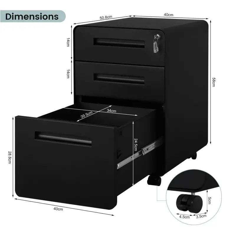 Gemaakt van hoogwaardig metaal, biedt deze archiefkast een solide en stabiele structuur voor duurzaam gebruik. De afgeronde randen zorgen niet alleen voor een veilige gebruikerservaring, maar dragen ook bij aan het esthetische aspect van de kast. Elke lade heeft een laadcapaciteit van respectievelijk 15 kg en 20 kg, waardoor deze kast ideaal is voor het opbergen van diverse kantoorartikelen en dossierdocumenten.