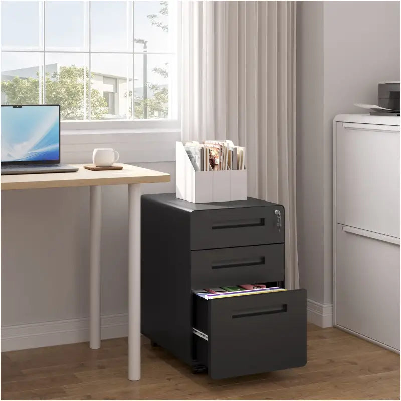 De archiefkast is voorzien van een centraal slot dat alle 3 de laden vergrendelt, waardoor uw documenten veilig worden opgeborgen. Dankzij de 4 wielen, waarvan 2 met remmen, kan de kast eenvoudig worden verplaatst en stevig worden vastgezet. Hierdoor kunt u de kast onder uw bureau schuiven om ruimte te optimaliseren terwijl uw documenten binnen handbereik blijven. Met de mogelijkheid om slechts één lade tegelijk te openen, biedt deze archiefkast extra stabiliteit en gebruiksgemak.