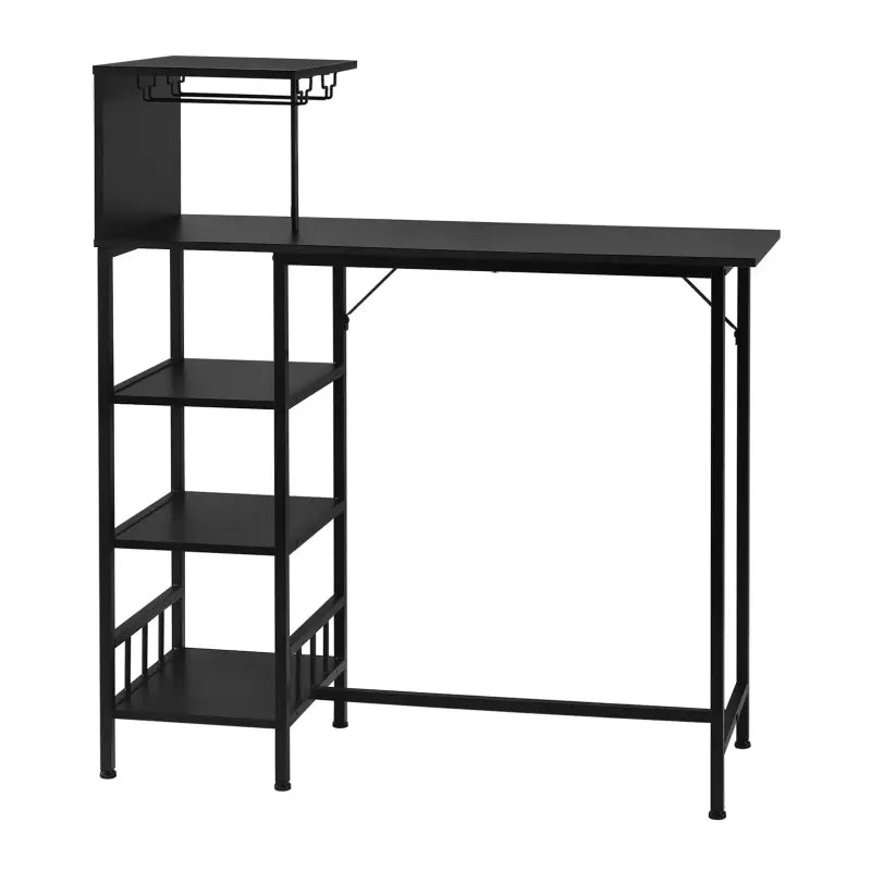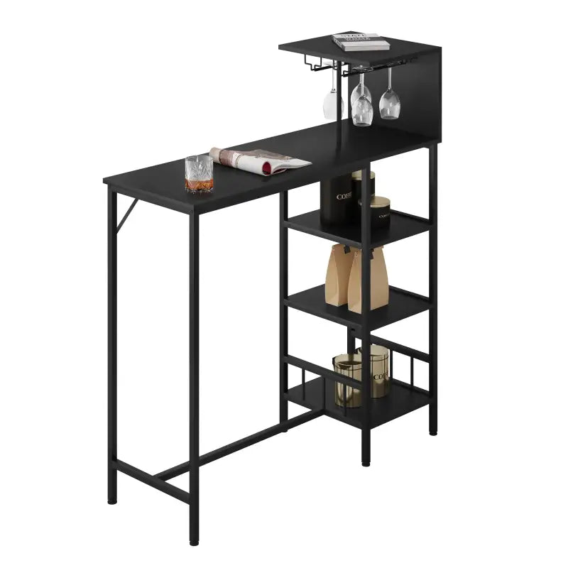 Deze bartafel is uitgerust met drie planken onder het tafelblad, waarvan de onderste is voorzien van staven voor het opbergen van wijnflessen. Boven het tafelblad bevindt zich nog een plank met twee glashouders, waardoor je gemakkelijk je glazen kunt opbergen. Of het nu gaat om barbenodigdheden, keukengerei of andere items, deze tafel biedt voldoende ruimte om alles georganiseerd te houden.