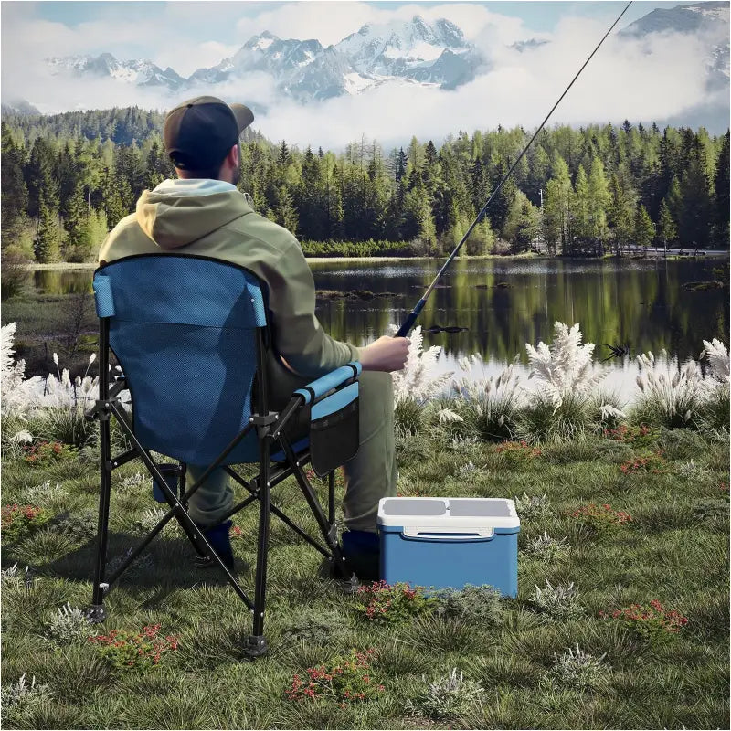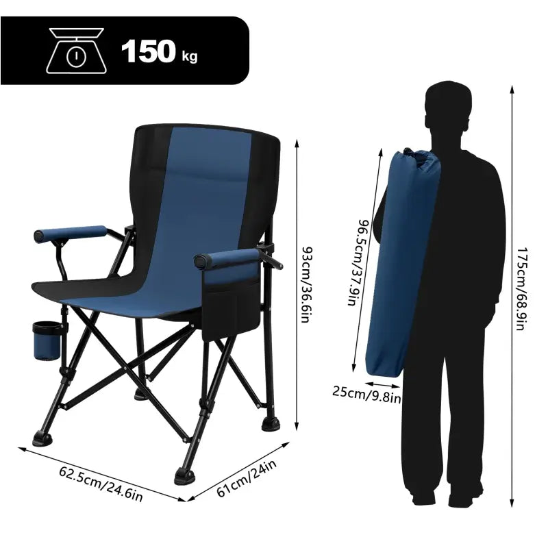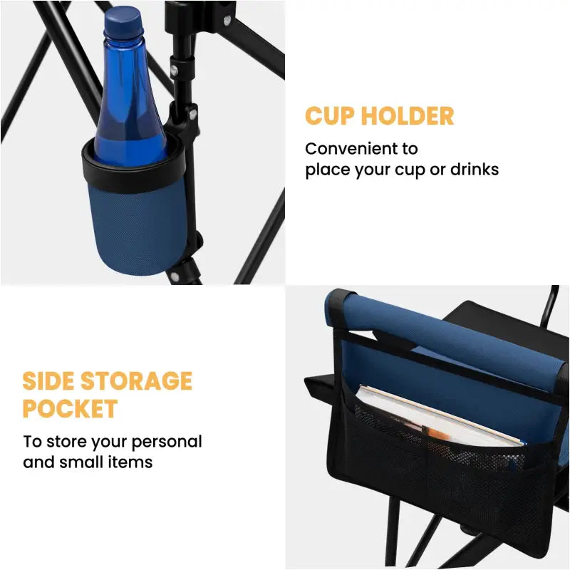 Naast de robuuste constructie biedt de stoel ook uitzonderlijk zitcomfort. De zitting van 51 x 46 cm, voorzien van een hoofdsteun en gewatteerde armleuningen, zorgt voor comfortabel zitten gedurende langere periodes. Bovendien is de stoel uitgerust met een bekerhouder en een zijzak, handig voor het opbergen van uw drankje, zonnebril, boeken of snacks. Alles binnen handbereik voor optimaal genot van uw vrije tijd.