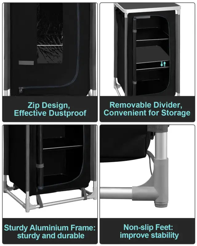 De BukkitBow campingtafel onderscheidt zich door de geïntegreerde opbergmogelijkheden onder het tafelblad. De drie-laagse hangende opbergtas, voorzien van verwijderbare schappen, biedt voldoende ruimte voor het organiseren en opbergen van jouw spullen. Of het nu gaat om voedsel, kookgerei of andere benodigdheden, alles blijft netjes en binnen handbereik. De ritsdeur beschermt je spullen tegen stof, terwijl het mesh-materiaal zorgt voor een goede luchtcirculatie, zodat alles fris blijft. Bovendien zijn er drie zijvakken beschikbaar voor het opbergen van kleinere items zoals messen, vorken of kruiden, waardoor je altijd gemakkelijk toegang hebt tot wat je nodig hebt.