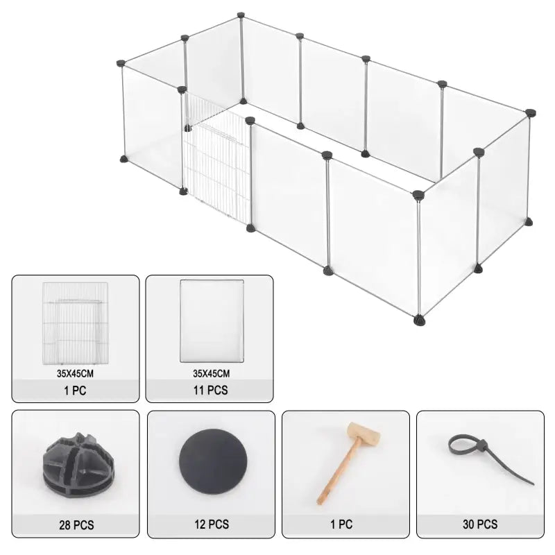 De BukkitBow Dierenren met Dichte Panelen biedt een veilige en veelzijdige speelruimte voor uw kleine huisdieren. Met afmetingen van 142x72x45cm en een DIY-ontwerp kunt u eenvoudig verschillende vormen creëren om aan de behoeften van uw huisdieren te voldoen. Gemaakt van hoogwaardig ijzer, plastic en metaal, is deze ren duurzaam en geschikt voor zowel binnen- als buitengebruik. De 11 panelen van 45x35cm, in combinatie met een deur van 35x45cm, bieden een ruime omgeving voor katten, konijnen, puppy's, hamsters, egels en cavia's om veilig te spelen en te bewegen.