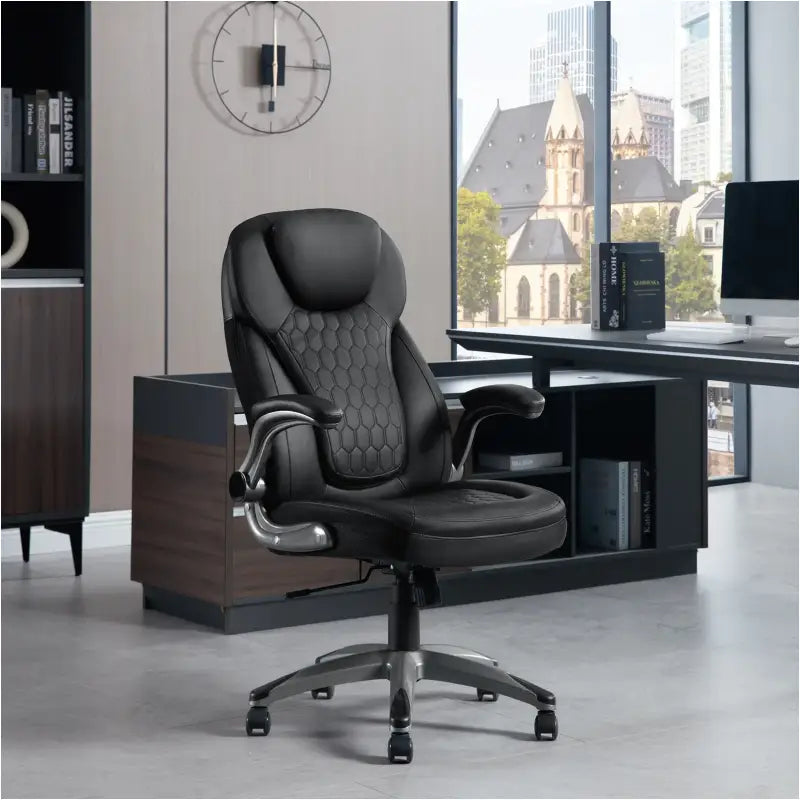 Het ergonomische ontwerp van de stoel zorgt ervoor dat je lichaam goed wordt ondersteund, waardoor je werkcomfort wordt verbeterd en je efficiënter kunt werken. De dikke vulling van meerlaags hoog veerkrachtig schuim in de rugleuning, zitting en armleuningen biedt directe ontspanning en comfort, terwijl de verstelbare hoogte je in staat stelt om de stoel aan te passen aan jouw voorkeur.
