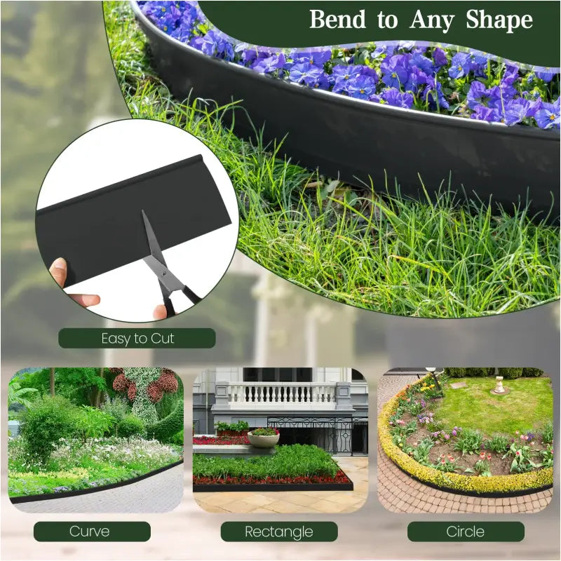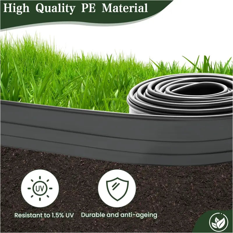 Dankzij het buigzame ontwerp kunt u de gazonrand gemakkelijk naar wens vormen en snijden. Of het nu gaat om gebogen, golvende of rechte paden, deze rand past zich perfect aan elke vorm aan. De installatie is een fluitje van een cent: rol de rand uit, plaats het in de vooraf voorbereide gleuf, druk de aarde aan en klaar is Kees. De bovenrand is afgerond om uw handen te beschermen tegen snijwonden tijdens het plaatsen. Bovendien zorgen de 2 longitudinale versterkingslugs en de versterkte randen ervoor dat de rand altijd rechtop en stevig verankerd in de grond blijft.