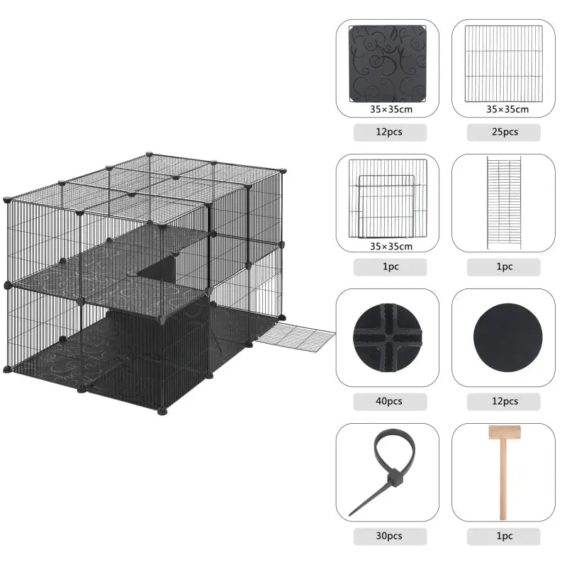 De kooi is voorzien van een stevig plastic platform dat gewicht kan dragen en voorkomt dat de poten van je huisdier vast komen te zitten of bekneld raken. Het roosterontwerp zorgt voor een duidelijk zicht en voldoende licht en luchtcirculatie, terwijl de zwarte plastic platen voorkomen dat de poten van je huisdier vast komen te zitten. Eenvoudig te monteren en demonteren, deze knaagdieren ren wordt geleverd met alle benodigde accessoires, waaronder roosterplaten, plastic platen, connectoren, kabelbinders, antislipmatten, een deur, een ladder en een kleine hamer.
