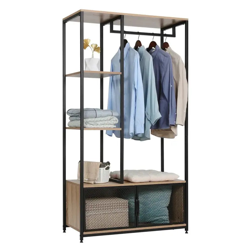 Deze industriële kapstok is ontworpen met praktisch gebruik in gedachten. Het open ontwerp maakt het gemakkelijk om kleding op te hangen aan de metalen kledingrail en om accessoires op te bergen in de ruime opbergvakken. Of het nu gaat om kussens, schoenen of tassen, deze kapstok biedt de perfecte oplossing voor het organiseren van uw spullen.