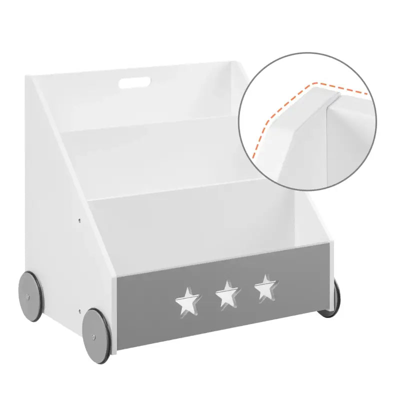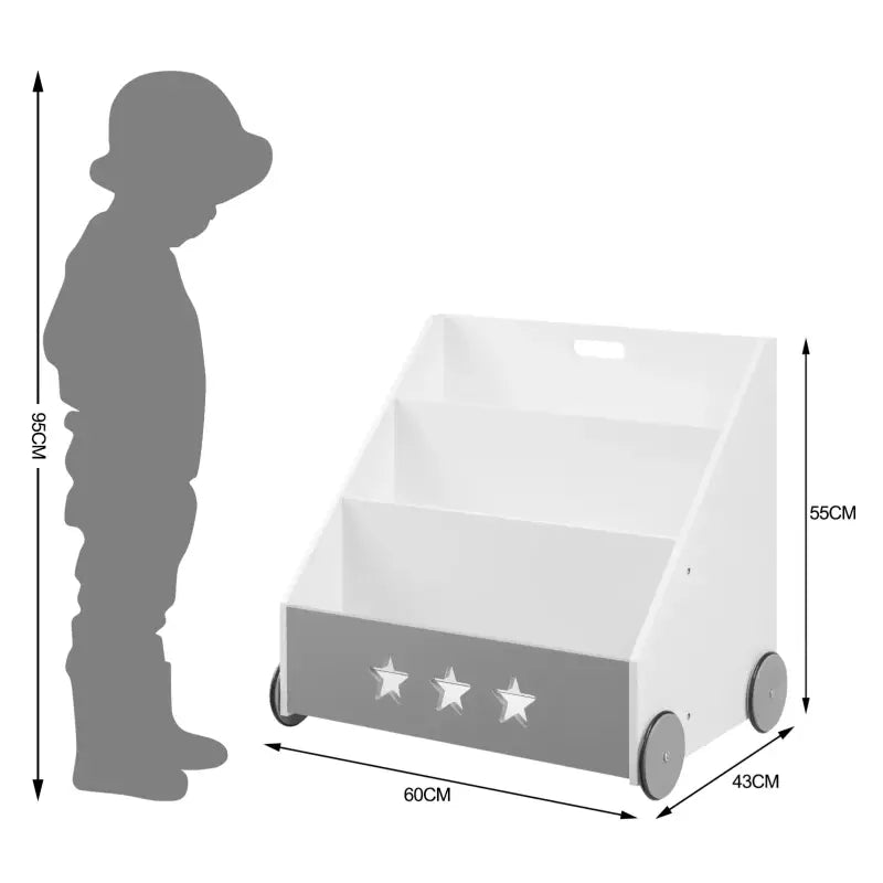 BukkitBow - Kinderboekenkast met Speelse Sterpatronen - Grijs met Wit - Trapeziumvormig - Met Wielen - 43x58x60cm