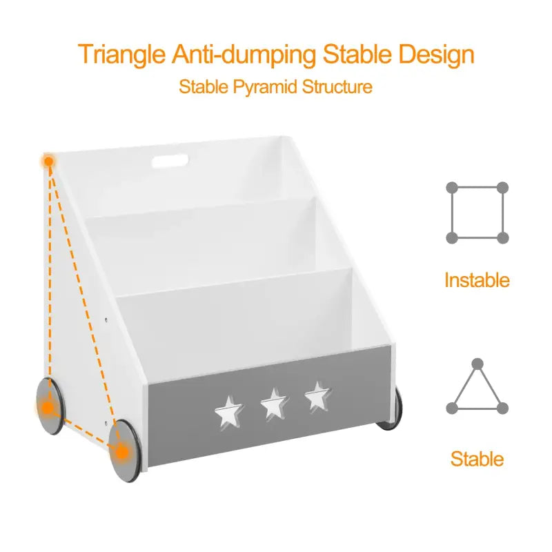 Met zijn grijze en witte kleurencombinatie en uitgesneden sterdecoraties is deze kinderboekenkast niet alleen functioneel maar ook esthetisch aantrekkelijk. De kast beschikt over drie opslagcompartimenten van verschillende hoogtes, perfect voor het organiseren van boeken van verschillende formaten. Het trapeziumvormige ontwerp maakt het gemakkelijk voor kinderen om hun favoriete verhalenboeken in één oogopslag te vinden en na het lezen weer op te bergen.