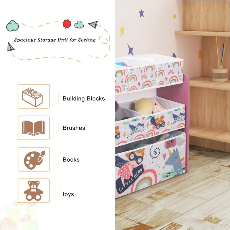 BukkitBow - Kinderen Opslag Plank - MDF en Massief Grenenhout - met 6 Stoffen Manden - Afgeronde Randen - Cartoon Ontwerp