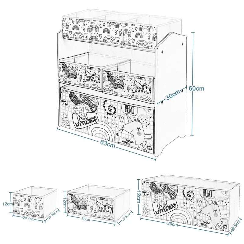 De BukkitBow Kinderen Opslag Plank combineert hoogwaardig MDF met massief grenenhout om een stevige en duurzame opbergoplossing te bieden voor de speelruimtes van kinderen. Met afmetingen van ongeveer 63x30x60cm (L x B x H) en zes stoffen manden in verschillende maten, biedt deze plank voldoende ruimte om boeken, speelgoed, kleding en andere items georganiseerd op te bergen. Dankzij het gebruik van milieuvriendelijke watergedragen verf is het oppervlak niet alleen veilig voor kinderen, maar ook aantrekkelijk met zijn schattige cartoonontwerp.