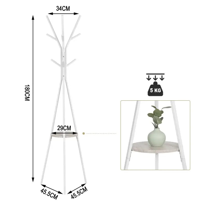 De kapstok is voorzien van een driepotige basis die zorgt voor stabiliteit, zelfs bij het dragen van zware kledingstukken. De ronde plank aan de bovenkant biedt niet alleen extra versterking voor de kapstok, maar kan ook worden gebruikt om decoratieve items zoals een telefoon, handtas, of fotolijstje op te plaatsen. Met zijn veelzijdigheid en duurzaamheid is deze kapstok geschikt voor verschillende ruimtes, waaronder ingangen, slaapkamers, woonkamers, kantoren en hotelkamers.