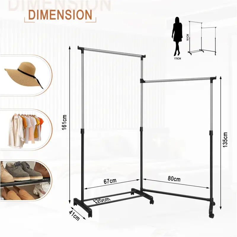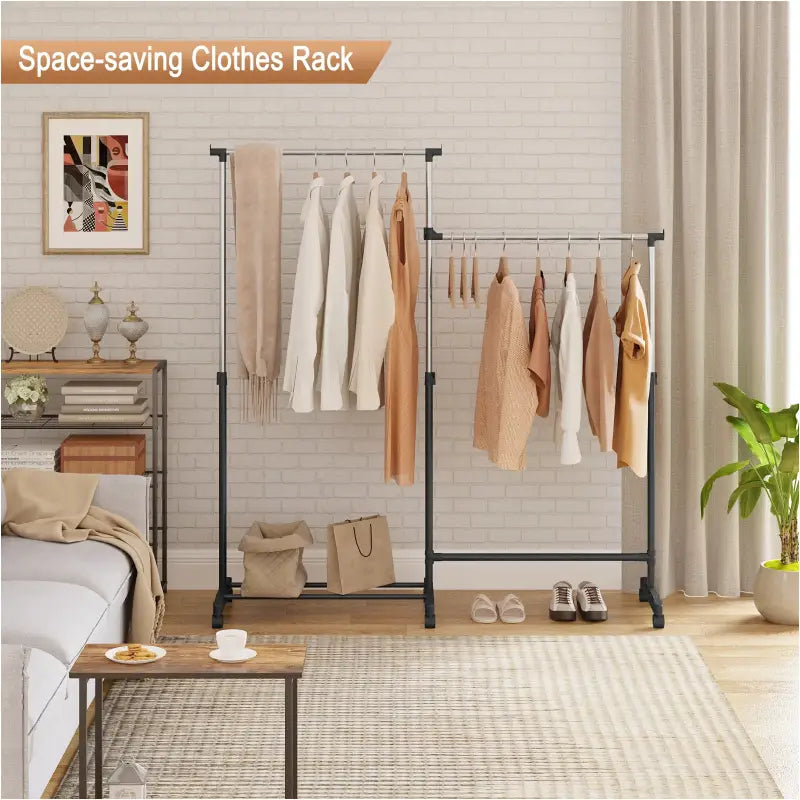 Dankzij de robuuste metalen buizen en hoogwaardige kunststof onderdelen is dit kledingrek zeer stabiel en kan het tot 35 kg dragen (elke kledingstang: 15 kg, het schoenenrek: 6 kg). Met 2 kledingrails voor kleding, tassen of accessoires, en een onderste plank voor schoenen, dozen en meer, is dit kledingrek ideaal voor zowel kleine ruimtes als ruimere omgevingen. De installatie is eenvoudig en vereist geen gereedschap, en gedetailleerde instructies worden meegeleverd voor een snelle montage.