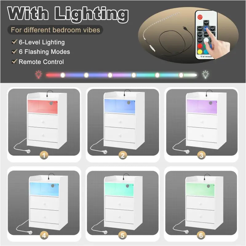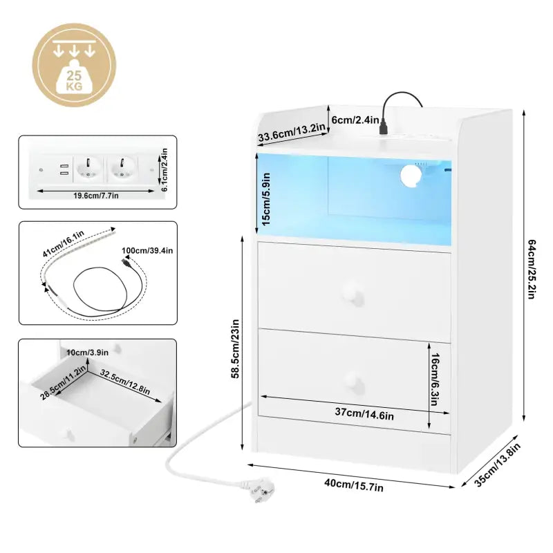 Dit nachtkastje wordt geleverd met een verstelbare LED-strip en afstandsbediening, waardoor u de helderheid en lichtmodi kunt aanpassen om verschillende sferen te creëren. Met een open compartiment, twee lades met metalen geleiders en een tafelblad met beschermende randen biedt dit nachtkastje voldoende opbergruimte voor al uw dagelijkse behoeften. De gladde randen en afgeronde hoeken zorgen voor veilig gebruik, terwijl de kabelbeheerfunctie aan de achterwand zorgt voor een opgeruimde uitstraling.