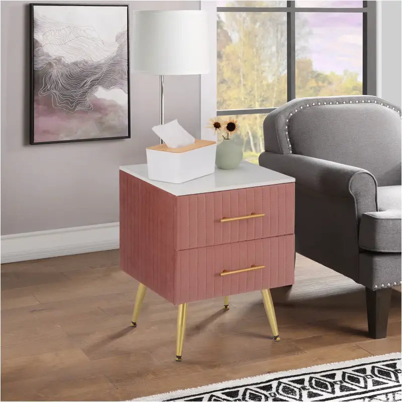 Het BukkitBow nachtkastje, gehuld in roze fluweel, oogt fris en uniek. De moderne, elegante en schone uitstraling geeft je slaapkamer een stijlvolle ambiance. Tegelijkertijd brengt het kleurenschema van roze voor het oppervlak en goud voor de poten meer comfort in je slaapkamer.