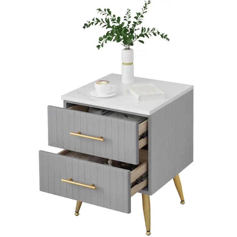 De laden van het nachtkastje zijn gemaakt van massief hout, wat sterk en duurzaam is. De buitenkant is bedekt met zacht fluweel en de tafel is uitgerust met vier stevige metalen poten voor ondersteuning. Het tafelblad is gemaakt van MDF-plaat met gemarmerde film, wat waterdicht, slijtvast en gemakkelijk schoon te maken is. Met de geïntegreerde stille metalen geleider kunnen de laden gemakkelijk worden uitgetrokken.