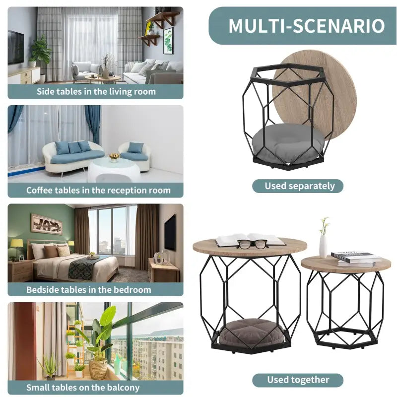 Het ontwerp van deze bijzettafels combineert natuurlijk en rustiek hout met modern metaal, waardoor ze een opvallende decoratie vormen in elke kamer. De tafels kunnen afzonderlijk of samen worden gebruikt en zijn geschikt voor diverse doeleinden, zoals bijzettafels in de woonkamer, nachtkastjes in de slaapkamer of zelfs als computertafel in je thuiskantoor. Met hun veelzijdigheid voegen ze niet alleen stijl toe aan je interieur, maar bieden ze ook praktische opbergmogelijkheden.