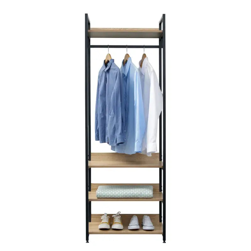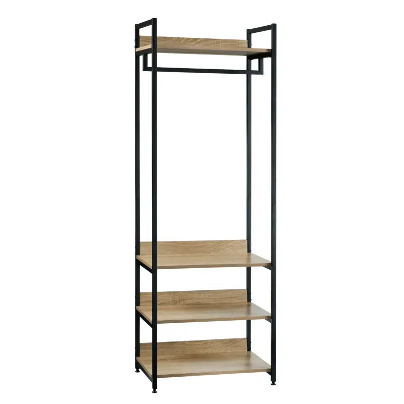 Deze staande kapstok van BukkitBow biedt een uitstekende oplossing voor het organiseren van uw kleding en accessoires. Met een combinatie van licht eikenhout en zwart staal past het perfect in elke moderne inrichting. Met afmetingen van 56 x 36 x 170 cm biedt deze kapstok voldoende opbergruimte met zijn drie planken onderaan en een plank bovenaan, evenals een kledingrail om uw jassen op te hangen.