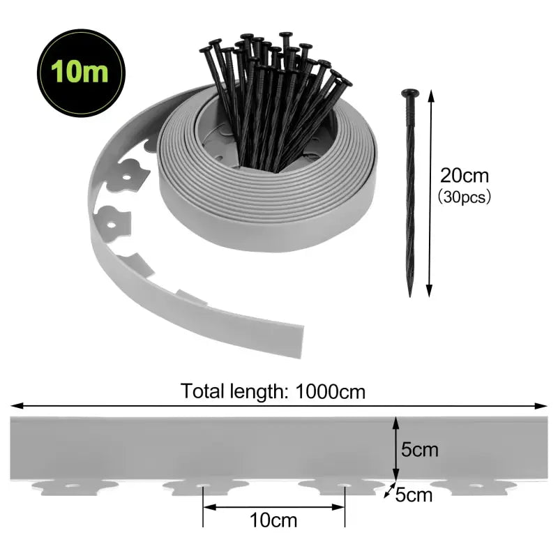 Deze tuinrand is ontworpen om bestand te zijn tegen de elementen. Het PE-materiaal is UV-bestendig, waardoor het niet broos wordt of barst na langdurige blootstelling aan de zon in de zomer. Bovendien kan het ook regen, sneeuw en vorst weerstaan in de winter, waardoor het het hele jaar door zijn schoonheid behoudt. Met een lengte van 10 meter en een hoogte van 5 cm biedt deze tuinrand voldoende dekking om uw bloembedden, gazons, paden en terrassen af te bakenen, terwijl het ook onkruid tegenhoudt.