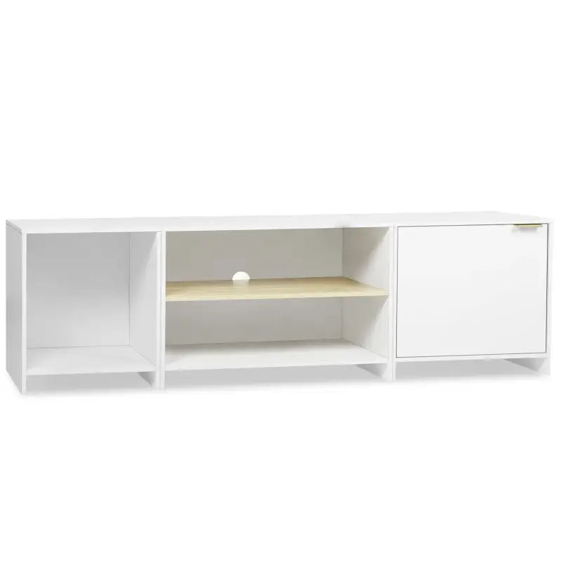 De BukkitBow TV-Kast met Opslagruimte biedt een ruime en veelzijdige oplossing voor het organiseren van uw entertainmentapparatuur en andere benodigdheden. Met een totale afmeting van 160 x 45 x 39 cm biedt deze kast voldoende ruimte voor televisies tot 70 inch. De drie open compartimenten en het kastje met verstelbare plank zijn perfect voor het opbergen van mediaboxen, spelconsoles, dvd's en andere items, waardoor uw woonkamer netjes en georganiseerd blijft.